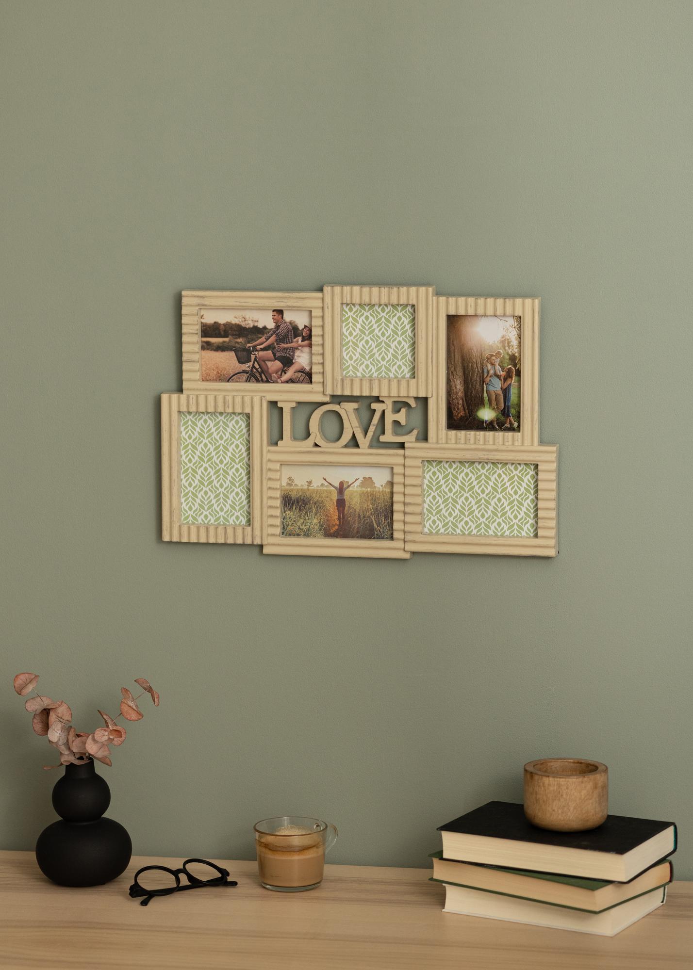 Está à procura de uma moldura com uma expressão natural, que tenha espaço para 6 fotos nos formatos retrato e paisagem? Então esta é a moldura para si. Esta moldura de colagem é adequada para 1 foto de 10x10 cm e 5 fotos de 10x15 cm. Ela numa cor castanha clara, textura de madeira com uma superfície lindamente desgastada e o texto "LOVE" entalhado no meio da moldura.