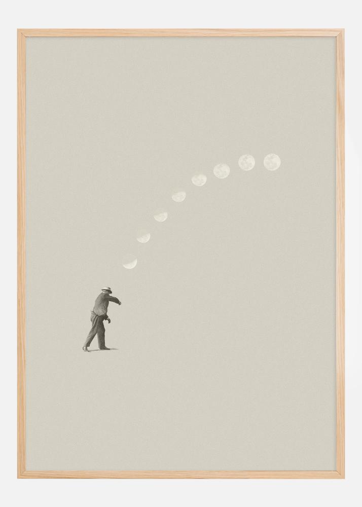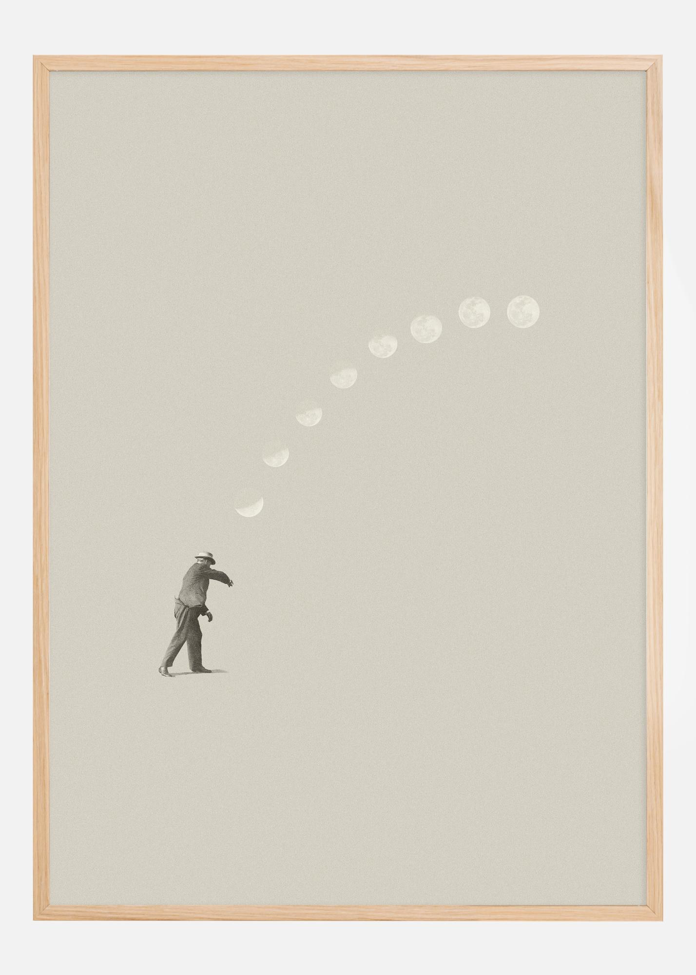 Este pôster poético retrata a silhueta de um homem que, com um movimento poderoso, lança uma lua para o céu. É uma cena que captura o momento de uma lua sendo elegantemente enviada e formando uma trajetória de várias fases lunares. Esta ação talvez simbolize sonhos e ambições impulsionados para possibilidades infinitas. O minimalismo da imagem reforça o gesto poderoso e deixa espaço para o observador preencher com sua própria história e significado.