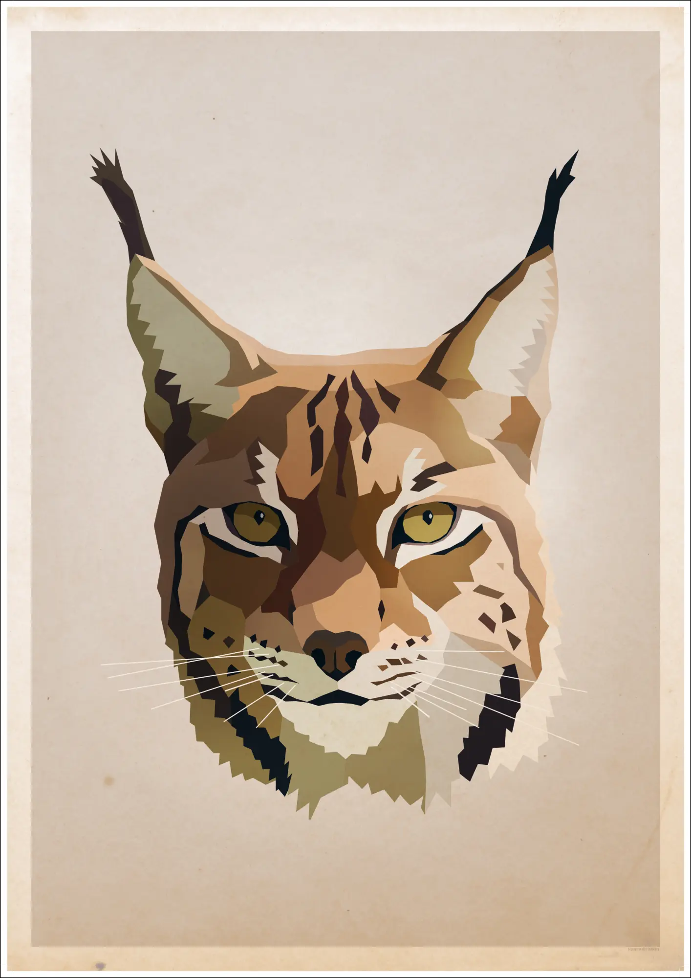 Um póster pastel intenso com uma bela lince. Num fundo rosa claro, os olhos do animal representam um olhar atento, porém dominante. As diferentes cores pastel marrom e verde se fundem lindamente nos olhos da lince.