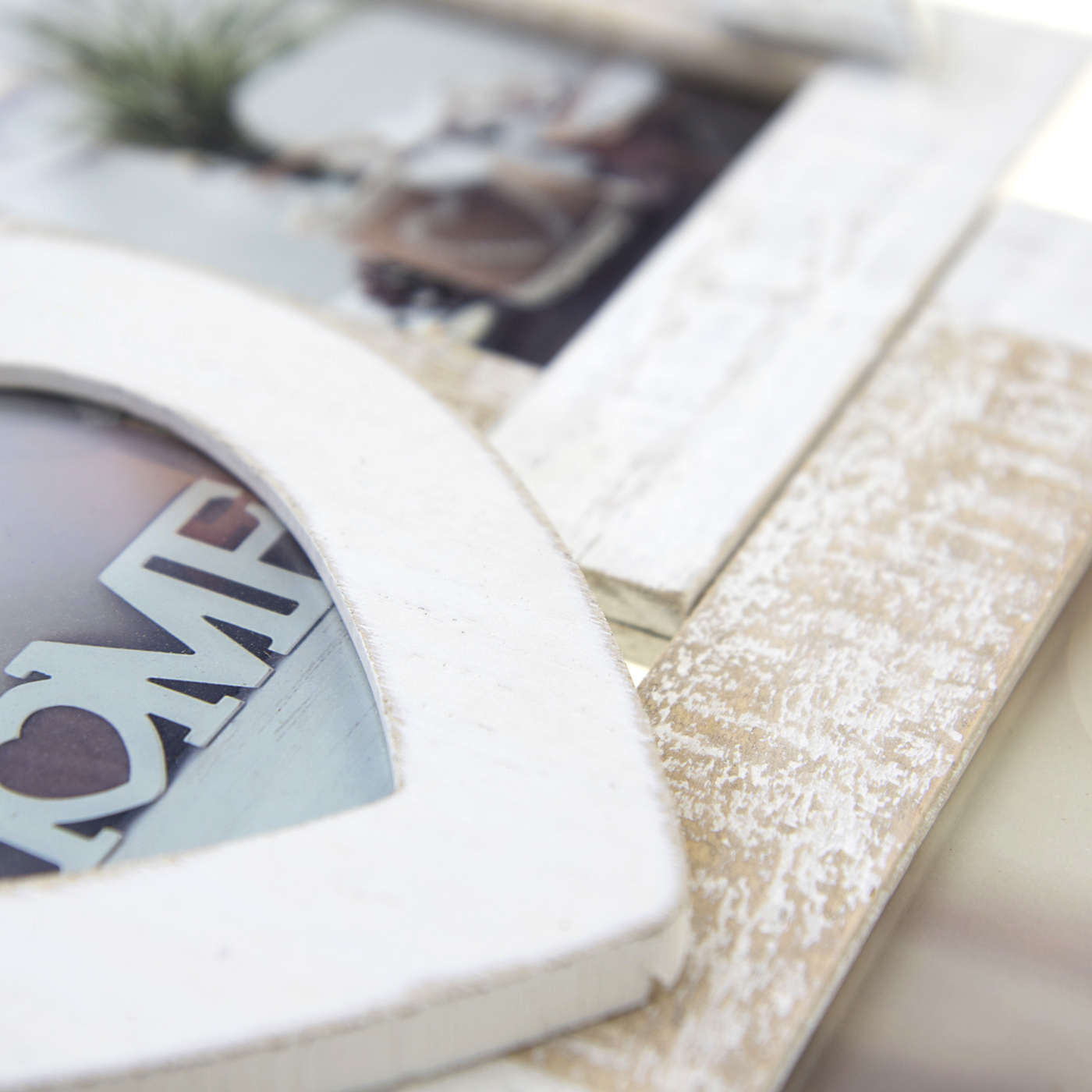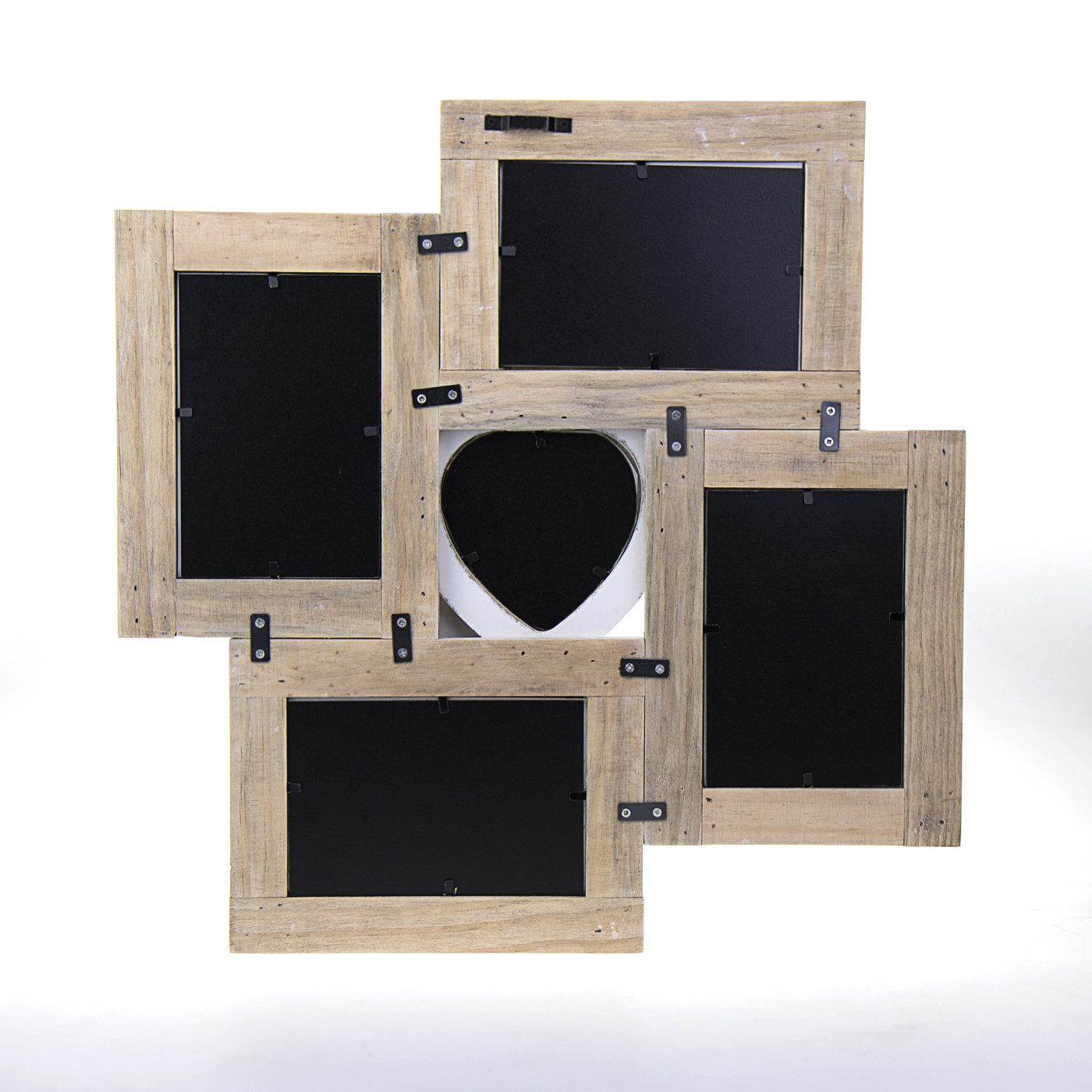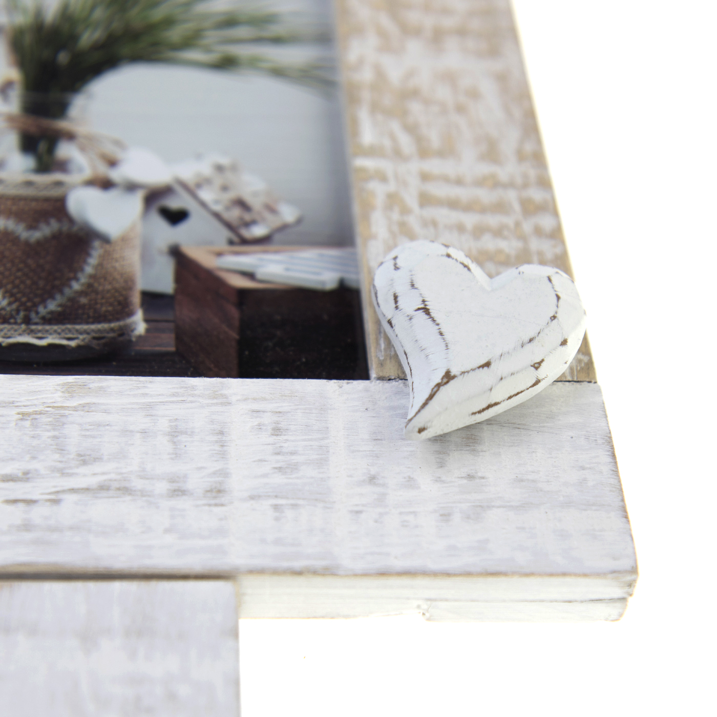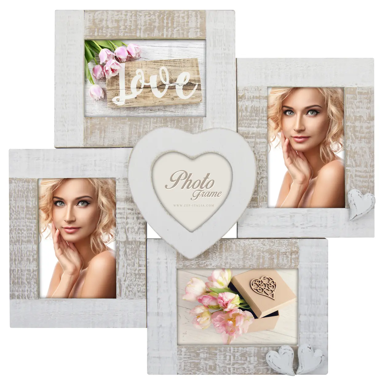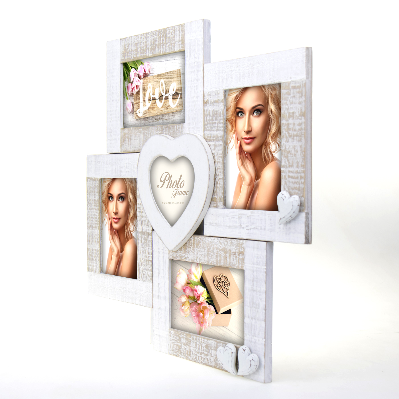 Esta é uma bela moldura de colagem em design romântico com corações decorativos. A moldura de colagem é feita de madeira e tem um tom branco clássico. Esta moldura tem espaço para 4 fotos de 10x15 cm e 1 foto menor de 10x10 cm. Suporte de parede incluído. As dimensões externas da moldura são 43x43 cm.