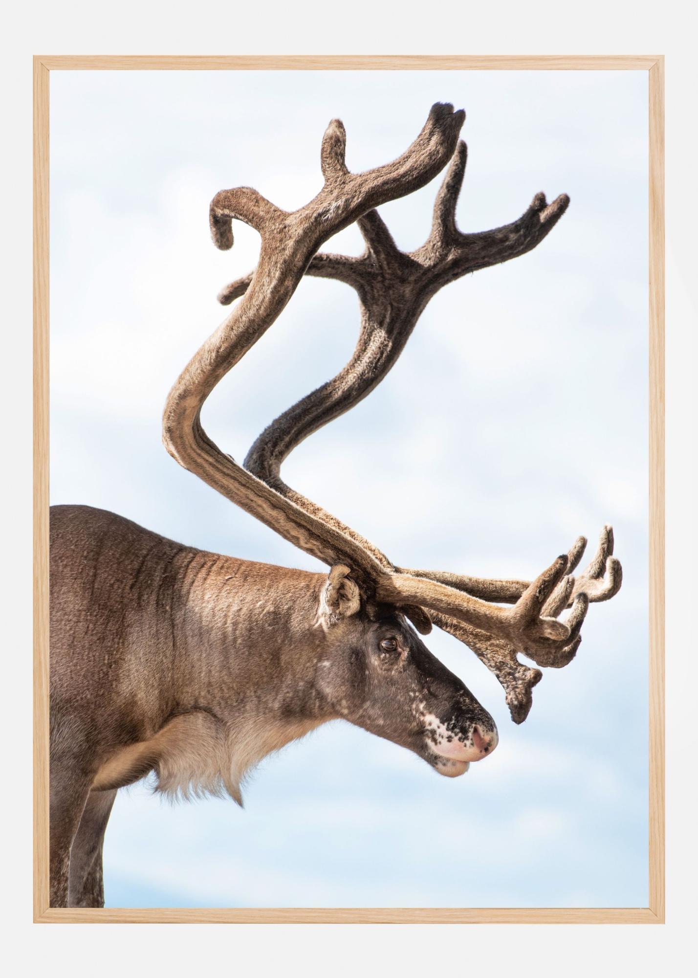 Este motivo apresenta um majestoso veado de perfil, com impressionantes hastes ramificadas, contra um céu suave e luminoso. A imagem tem uma expressão inspirada na natureza e no estilo nórdico, perfeita como poster ou cartaz para a sala de estar, quarto ou casa de montanha. A fotografia detalhada transmite uma sensação de vida selvagem, tranquilidade e força, sendo uma escolha natural para quem aprecia motivos de animais, design escandinavo e impressões de natureza modernas.