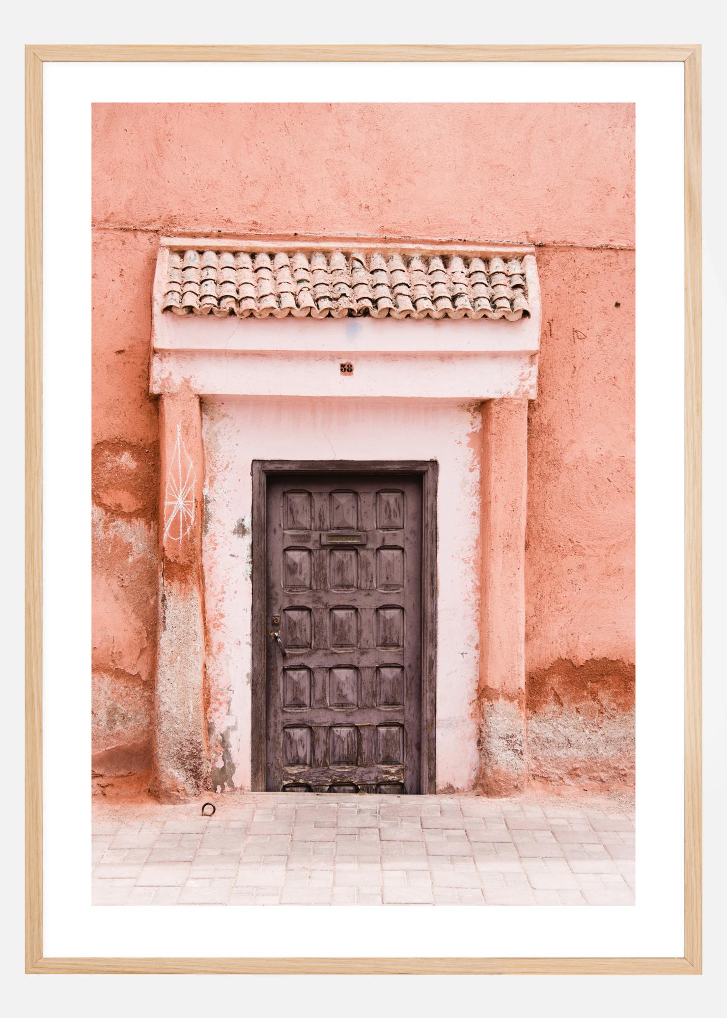 Uma bela impressão em tons de pêssego e marrom de uma porta de madeira marrom. A casa marroquina é pintada em um tom de pêssego lindo. A parede branca que cerca a porta adiciona um toque extra de luz ao retrato. Pendure este belo póster em tons de pêssego numa parede bege para criar uma sensação de harmonia.