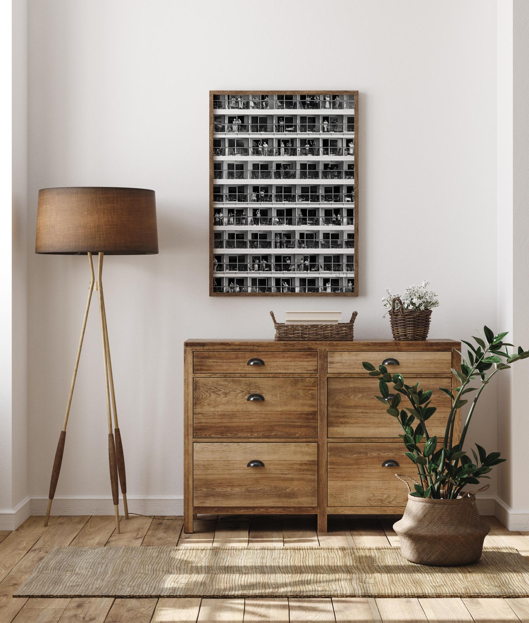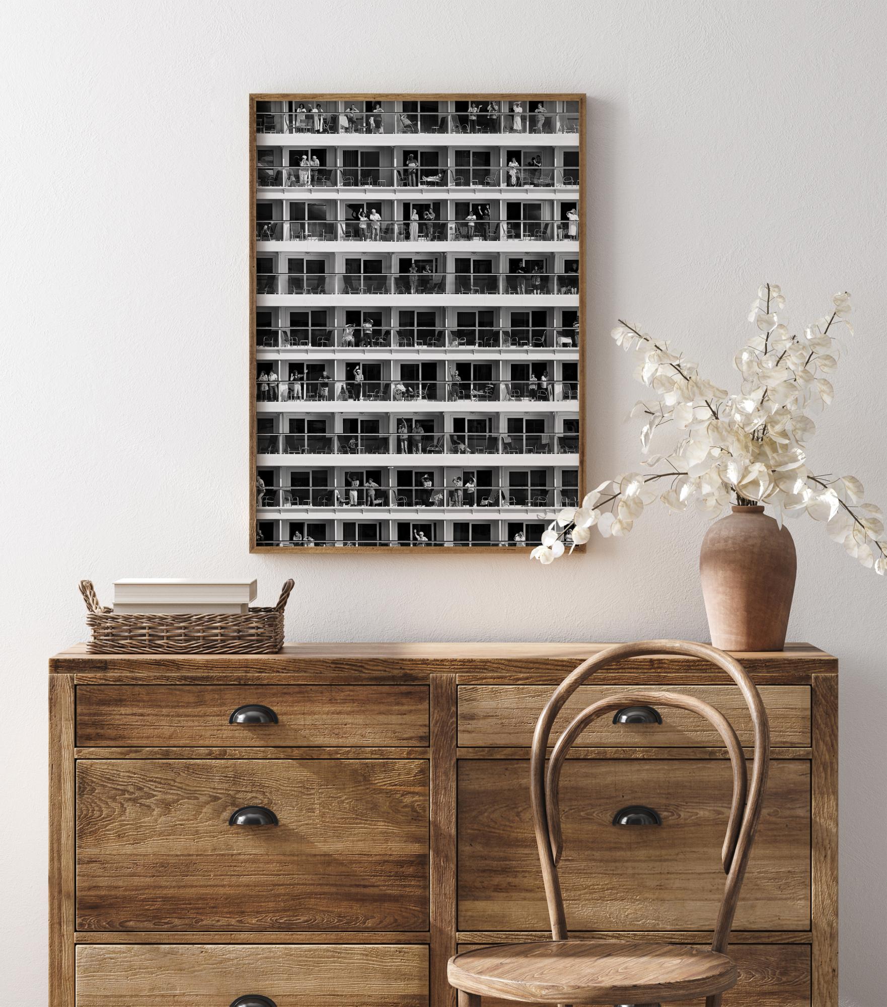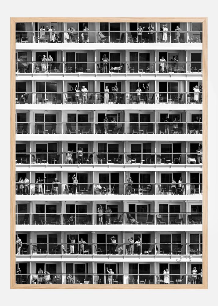 Um cartaz de viagem geométrico com fileiras de varandas e pessoas desfrutando do sol. Sinta o amor quando acenar de volta para todos os rostos amigáveis nesta imagem turística imaginativa.