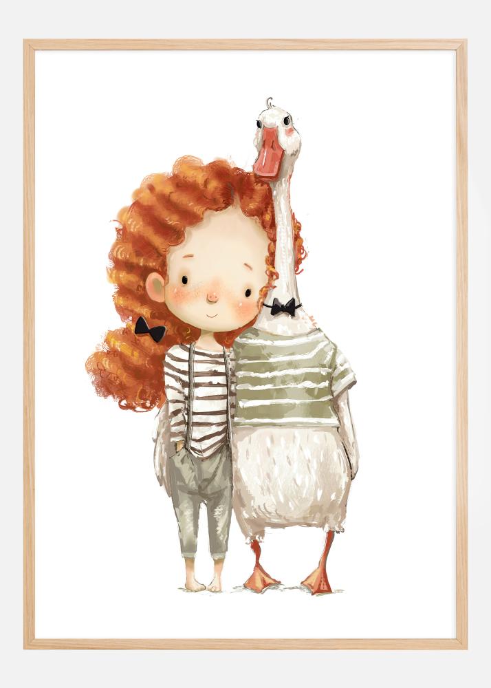 Este cartaz alegre e cativante retrata uma jovem com cachos vermelhos vibrantes, de pé ao lado de seu fiel companheiro, um grande pato. Eles compartilham um momento terno e feliz juntos, capturado nos tons suaves e quentes da pintura em aquarela. O encantador duo, com as bochechas rosadas da menina e o olhar curioso do pato, irradia amizade e alegria.