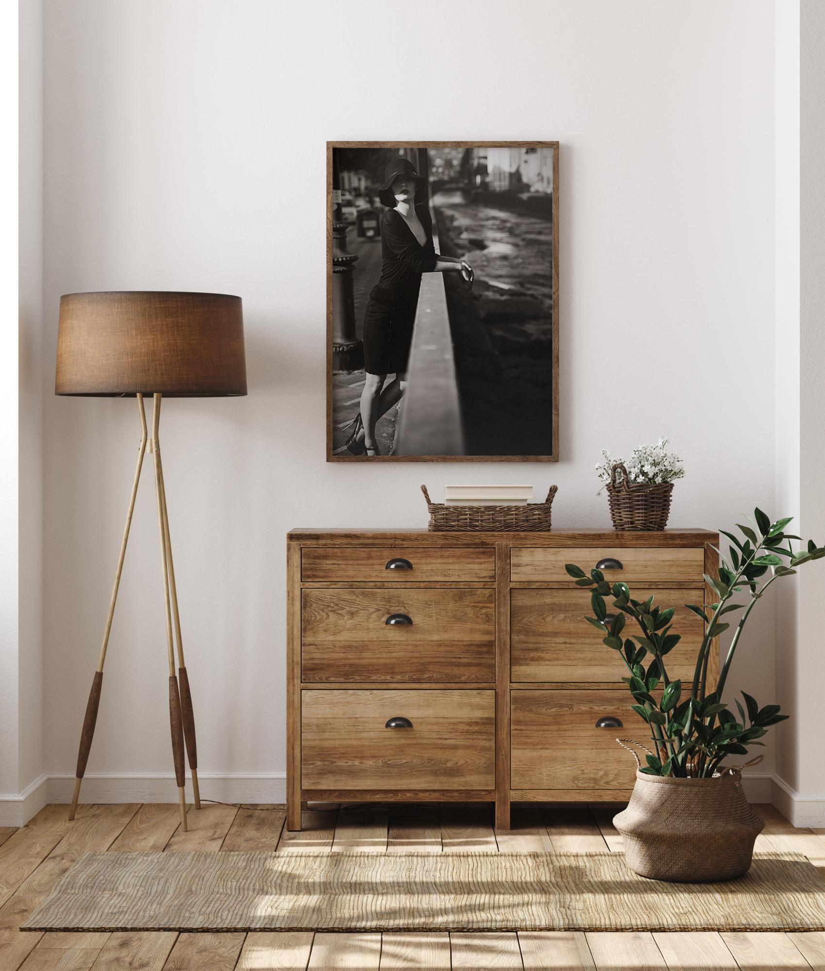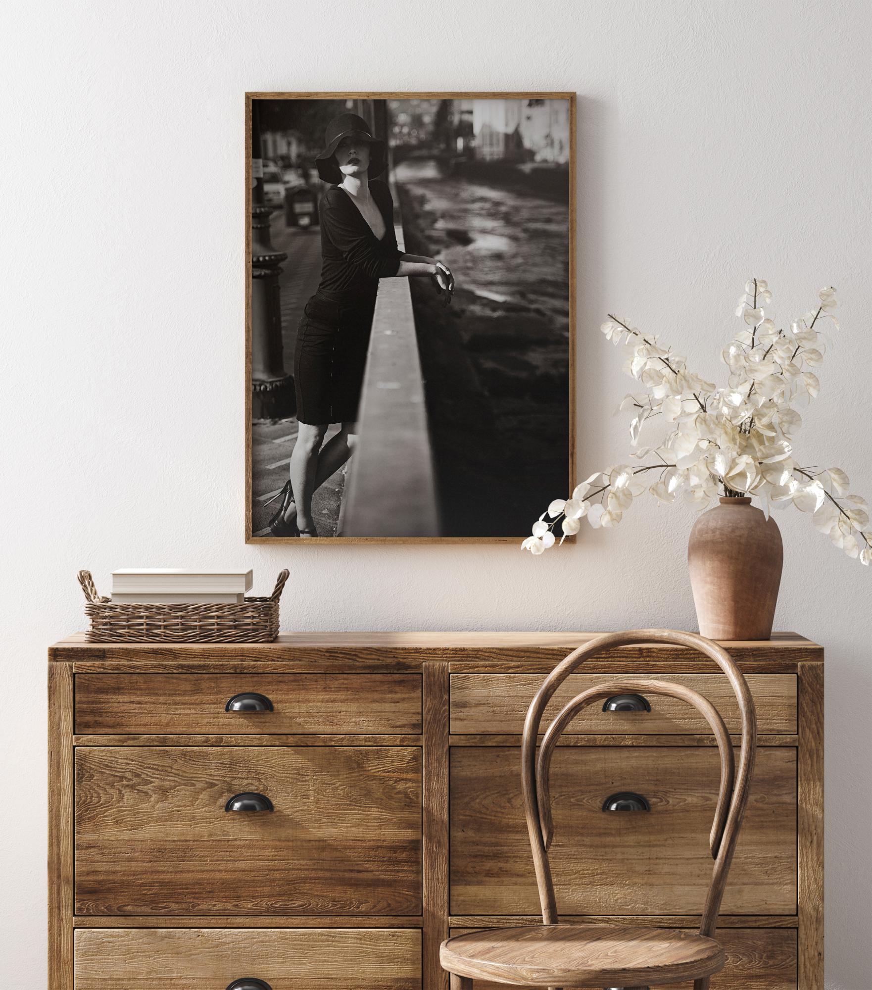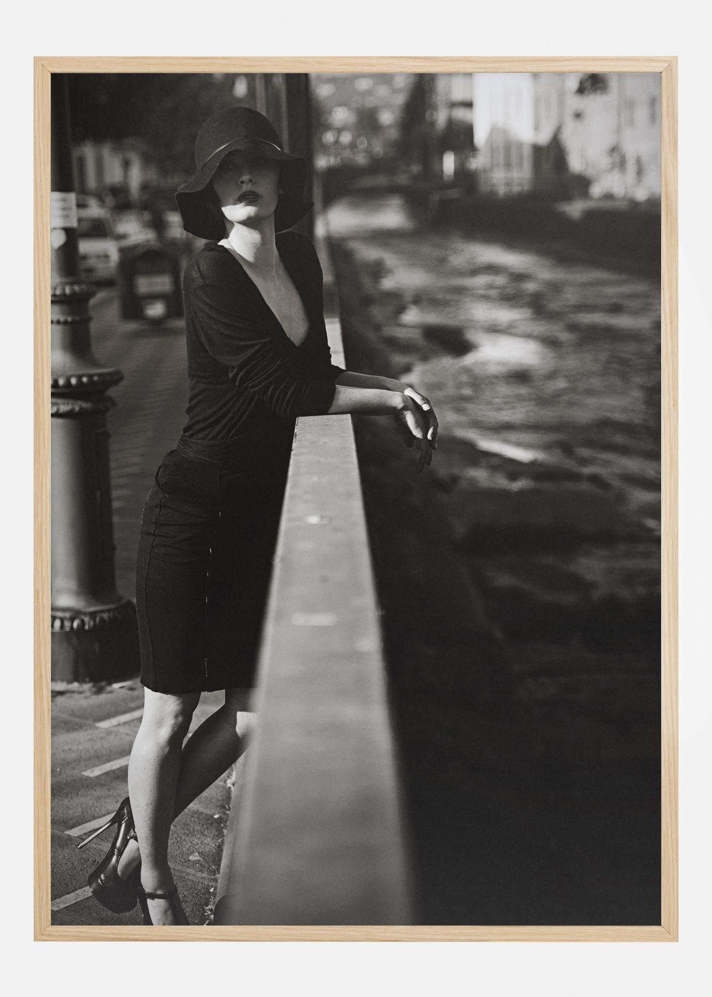 Um retrato de uma mulher apoiada numa parede. Esta foto incrível irradia classe e captura uma elegância relaxada como nenhuma outra. Coloque este póster na parede para obter uma sensação agradável dos anos 30.