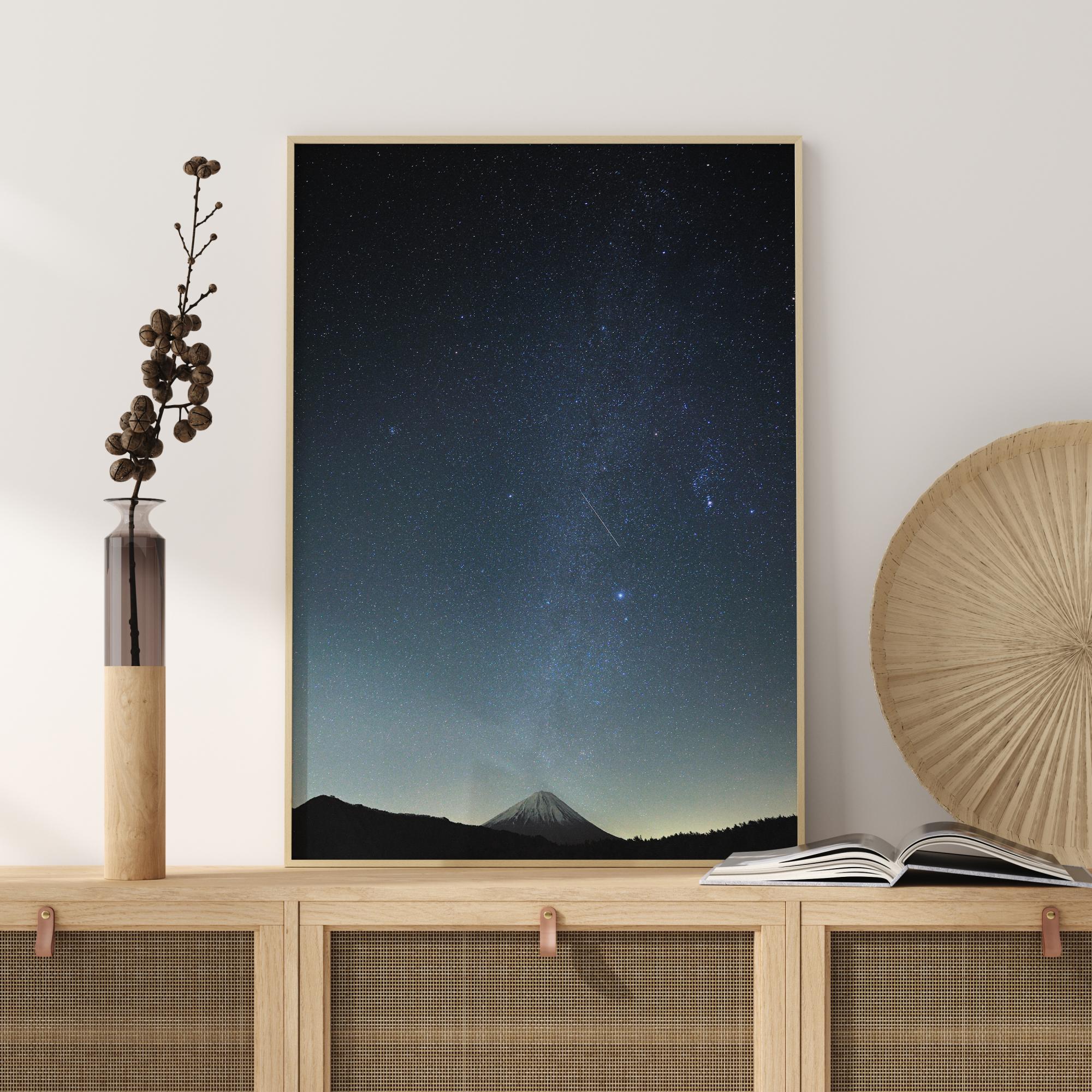 Um belo póster com um céu noturno e um meteoro. Com uma montanha coberta de neve ao longe, há uma sensação misteriosa sobre as estrelas brancas mágicas. Um raio de luz natural brilha atrás da montanha, criando a sensação mágica e misteriosa. Perfeito para um quarto de criança.