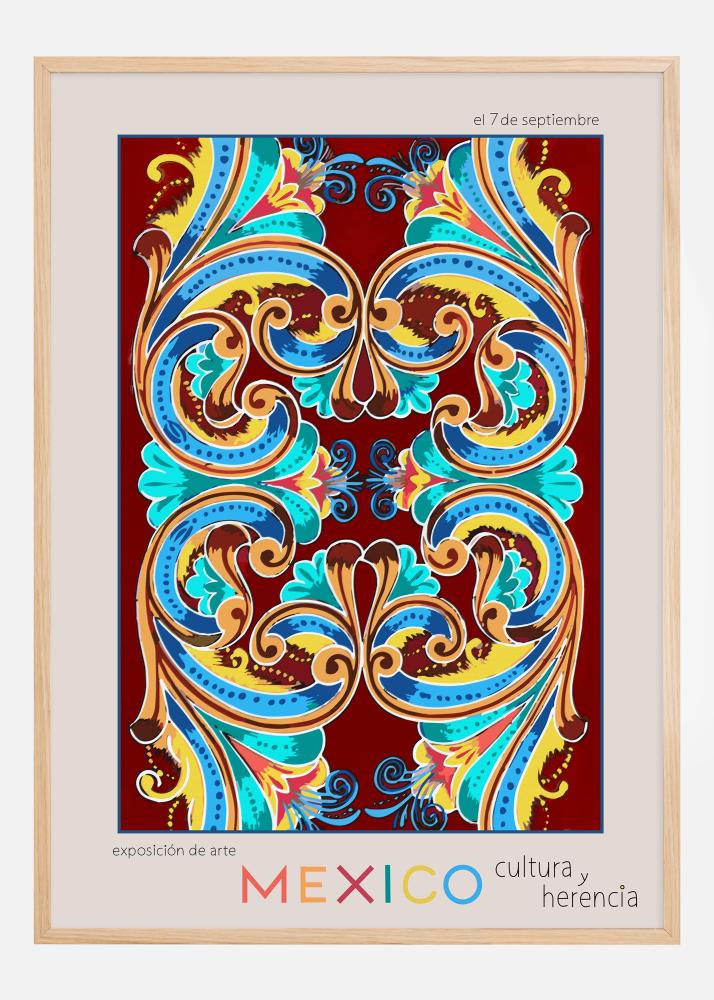 O cartaz é uma homenagem à rica paisagem cultural do México, e cada detalhe da ilustração é cuidadosamente elaborado para celebrar as tradições artísticas do país. A moldura de carvalho simples complementa as cores quentes e faz da obra de arte uma adição ideal a qualquer espaço que aprecia a diversidade cultural e a energia artística. Este cartaz é não apenas um convite a uma exposição de arte, mas também um convite para experimentar e apreciar a estética e o espírito únicos do México.