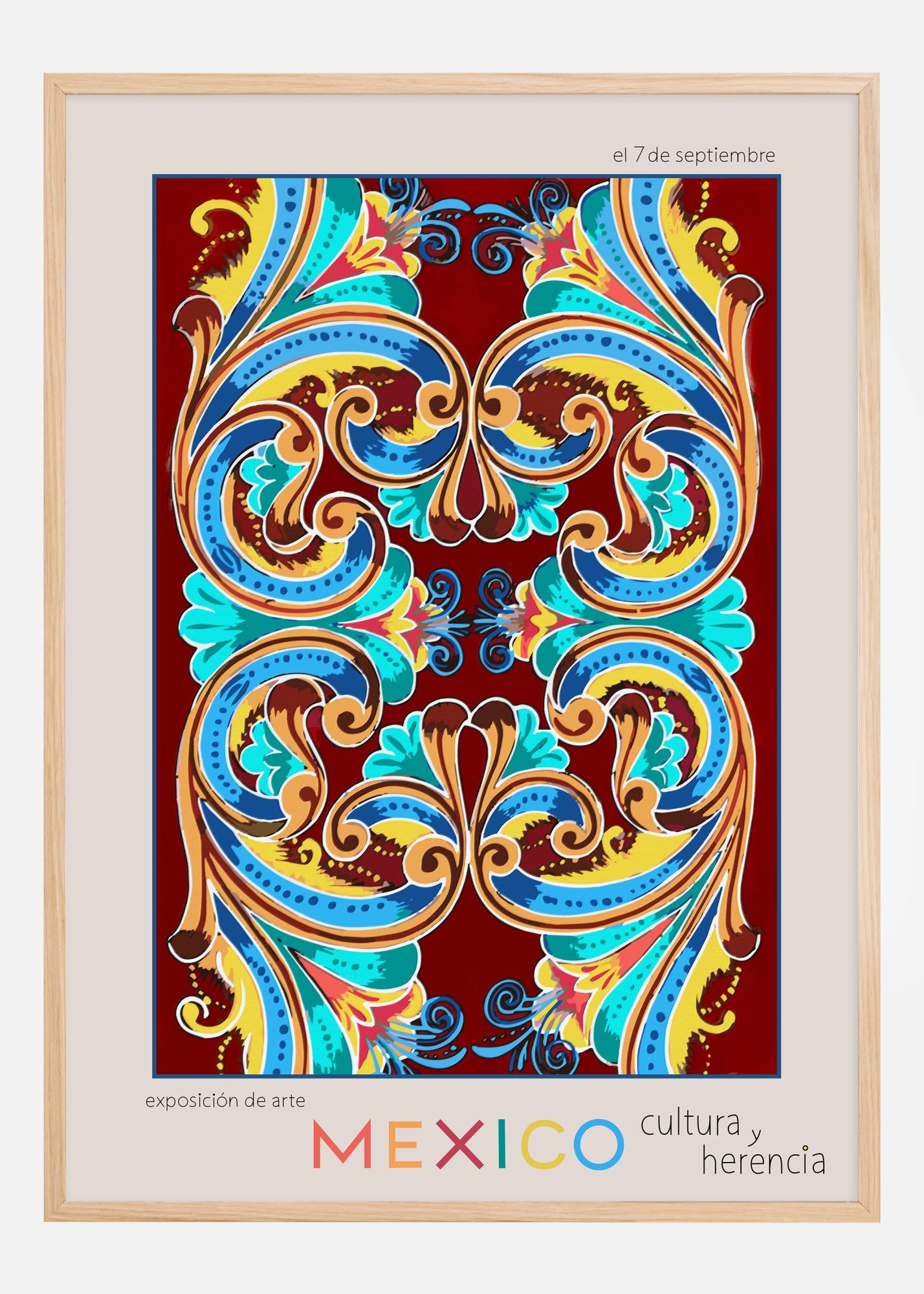 Este cartaz vibrante e colorido celebra uma exposição de arte no México. Seu design é inspirado em padrões tradicionais mexicanos, cheio de curvas ondulantes e exuberantes motivos florais que convidam o olhar a dançar sobre a imagem. As ricas cores vermelhas, amarelas e azuis são típicas da arte folclórica mexicana e simbolizam a cultura e herança da nação com um toque moderno.
