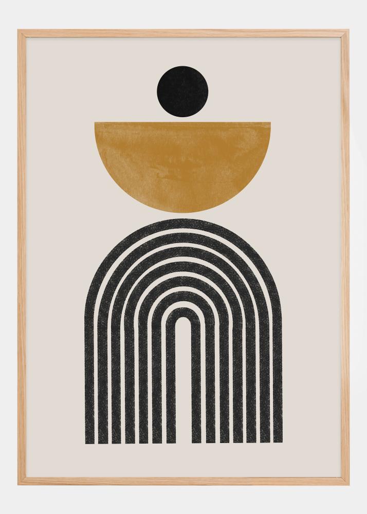 Mergulhe em um mundo de abstração e simetria com nosso pôster moderno que apresenta uma série de arcos em preto e branco sob um semicírculo dourado em forma de sol, complementado por um círculo preto. Esta impressão é uma ode à clareza da arte moderna e à simplicidade do design geométrico, proporcionando um toque sofisticado à sua decoração. As cores são ousadamente reduzidas para realçar o contraste e o peso visual de cada forma.