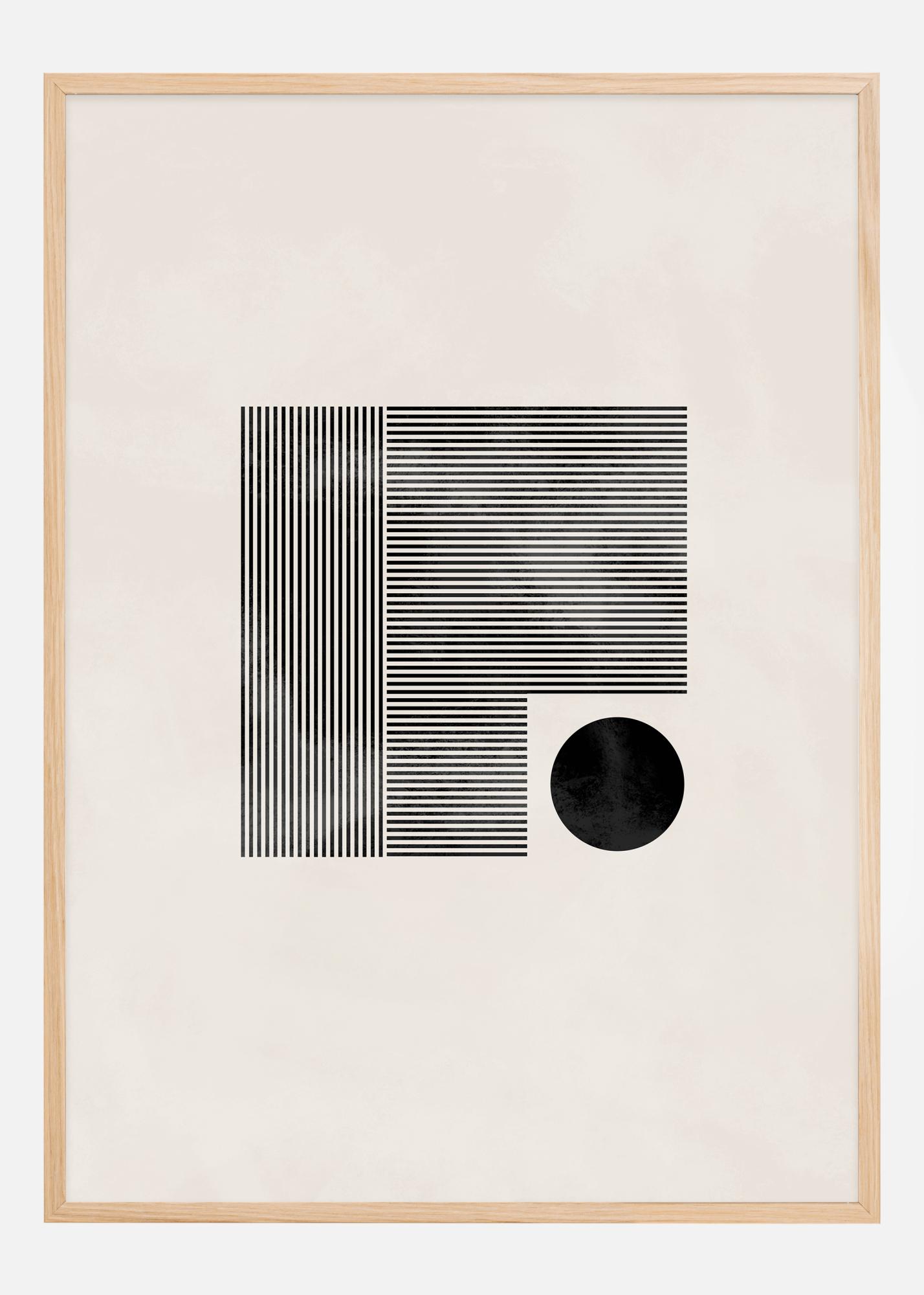 Este cartaz elegante e minimalista apresenta um jogo geométrico entre retângulos e um círculo, todos retratados em linhas e formas negras marcantes contra um fundo suave e creme. A composição rigorosa das linhas nos retângulos transmite uma sensação de ordem e estrutura, enquanto o círculo negro solitário quebra essa rigidez e introduz uma irregularidade que cria interesse visual e equilíbrio. Esta é uma obra de arte que pode ser apreciada por sua simplicidade e sua capacidade de complementar uma variedade de estilos de decoração.