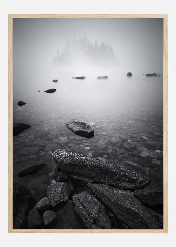 Um póster misterioso da natureza com pedras e um lago nebuloso. Imagine o que está lá fora quando olha para a ilha nebulosa coberta de árvores. deixe a sua casa mágica com essa incrível impressão numa parede azul.