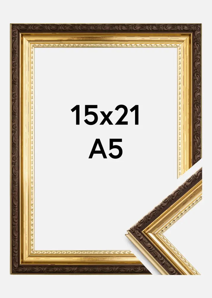 Está à procura de uma moldura lindamente decorada em um estilo mais antigo? Abisko Acrílico Dourada é uma moldura dourada robusta com ornamentos incrivelmente elegantes. A faixa da moldura, com 25 mm de largura, numa cor dourada brilhante com uma borda marrom decorada no meio. A parte dourada também é decorada, com um padrão ondulado próximo ao vidro.