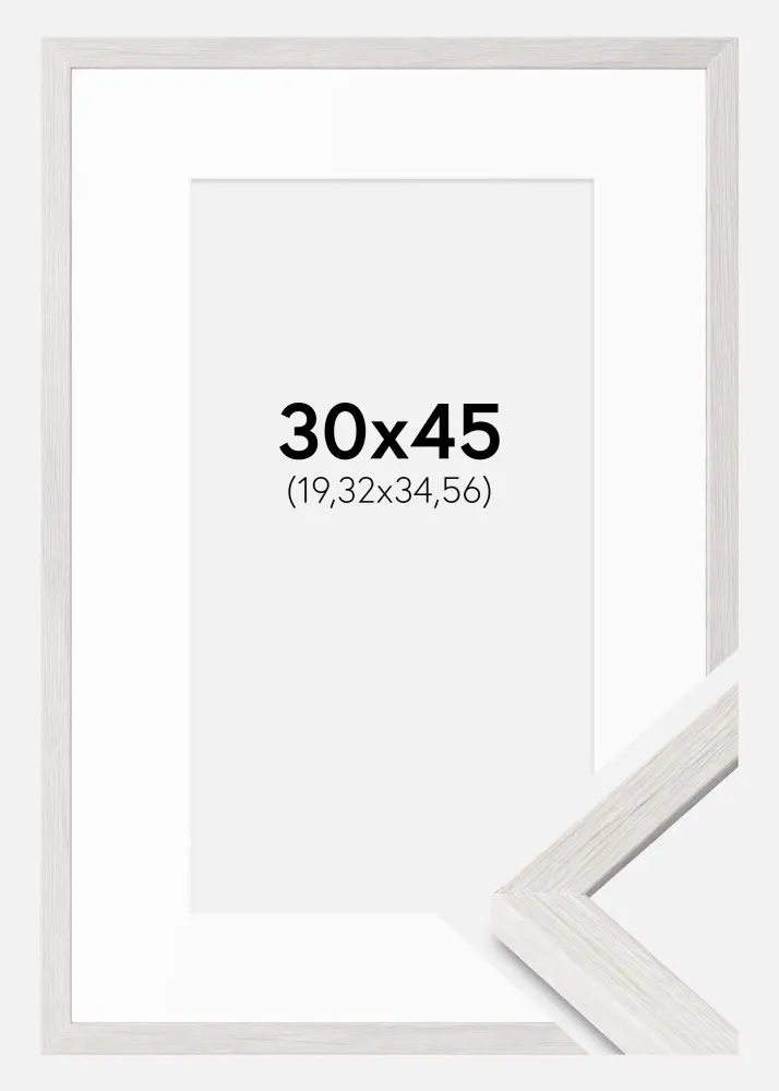 Passepartout adapta-se a uma imagem de 8x14 polegadas. A cor da moldura é carvalho branco com uma largura de 15 mm e uma profundidade de 20 mm. A cor do passepartout é branca.
