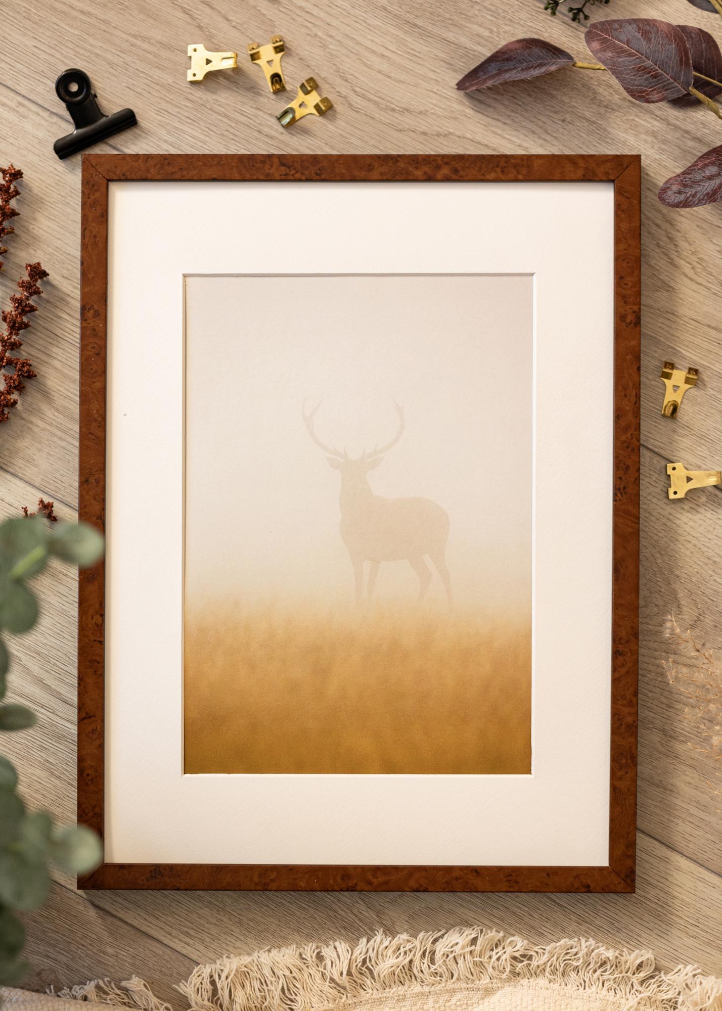 Descubra a elegância da sua casa com o nosso elegante quadro de fotos no tamanho de 45x60 cm. Este quadro tem uma clássica cor de nogueira que acrescenta uma sensação acolhedora e convidativa às suas fotos ou obras de arte favoritas. Feito de madeira de ayo genuína, este quadro oferece uma solução duradoura e esteticamente agradável para mostrar suas memórias.