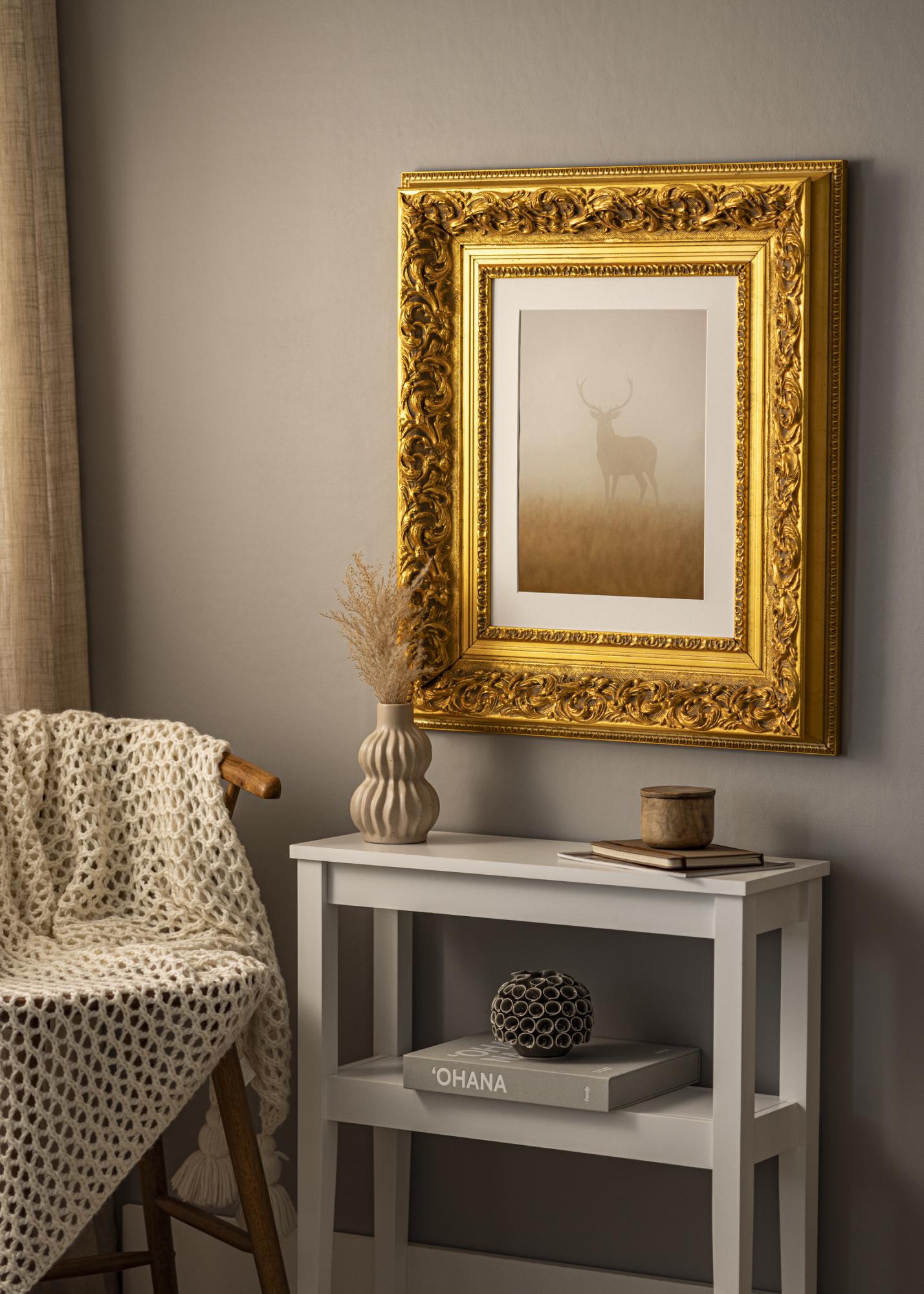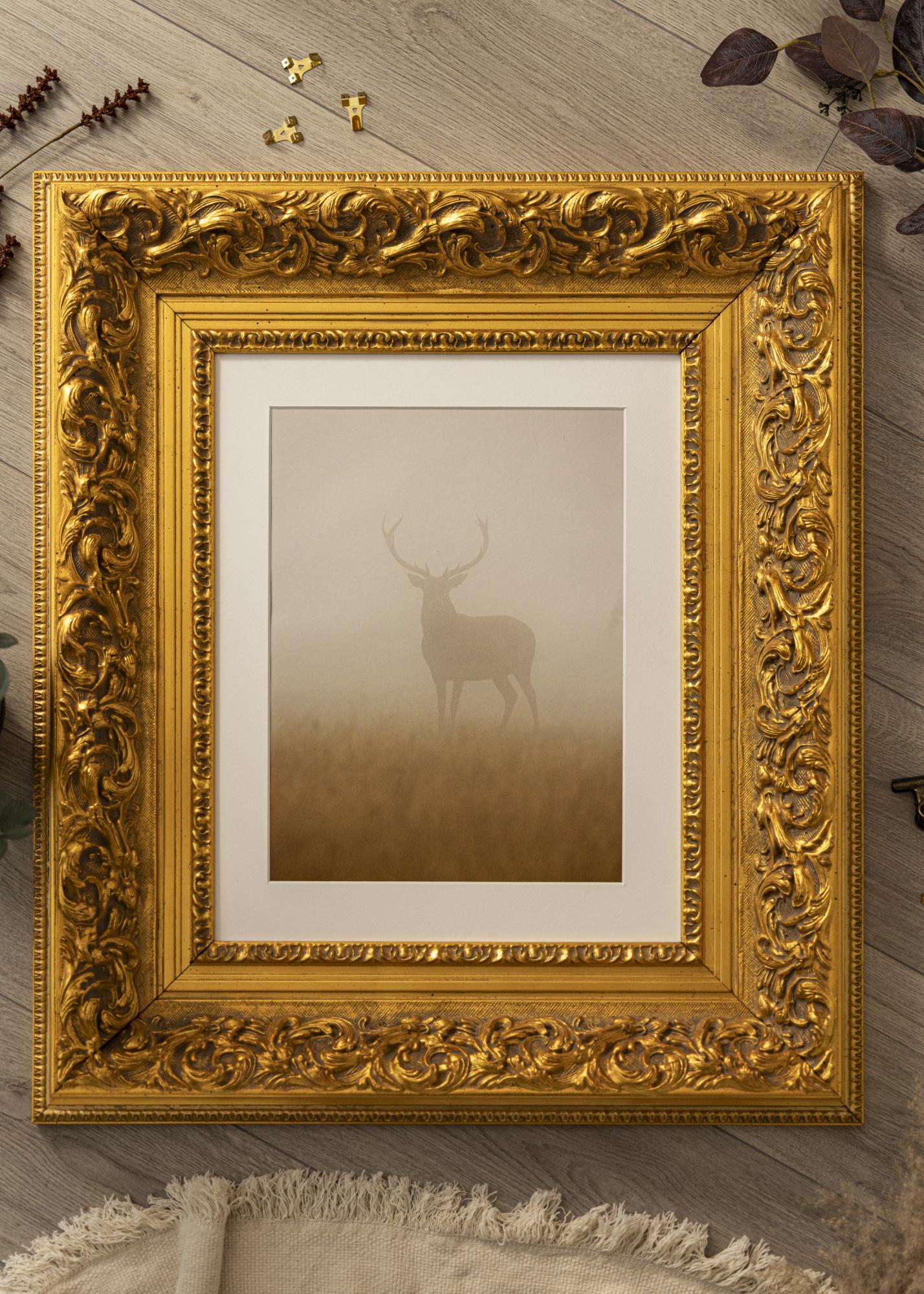 A nossa Moldura Birmingham Ouro é uma moldura personalizada que é fabricada no nosso próprio estúdio de molduras. Com o seu tom dourado profundo e design clássico barroco, é uma adição elegante a qualquer sala. Esta moldura fotográfica tem uma lista de moldura de 152 mm de largura e uma profundidade de 74 mm, conferindo-lhe uma presença impressionante na parede.