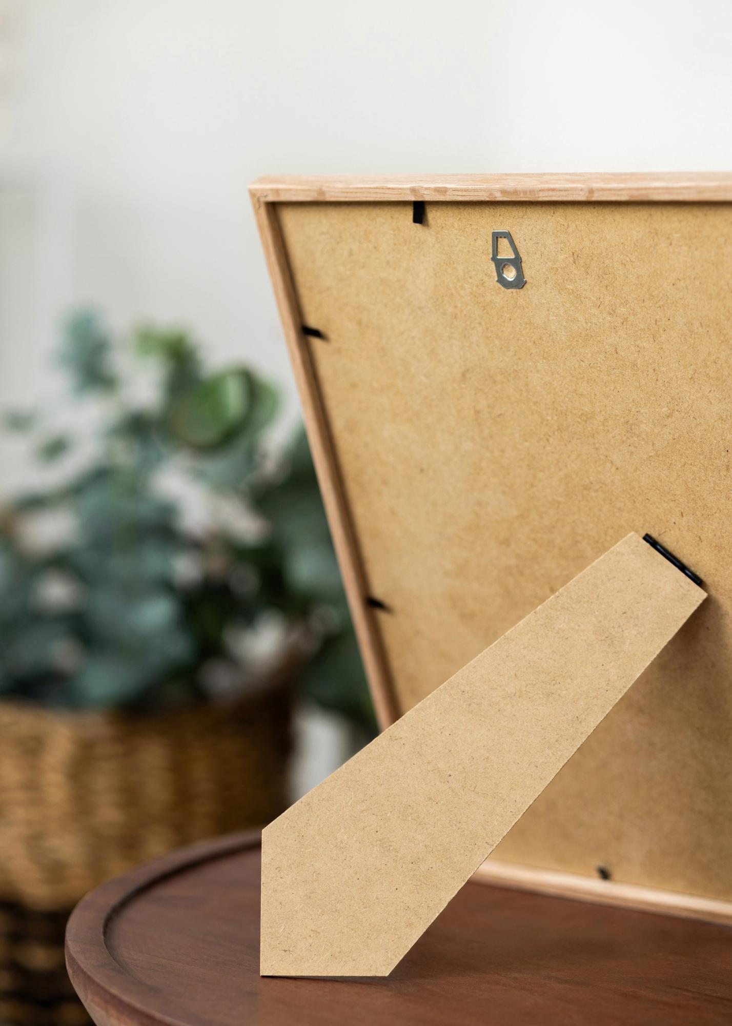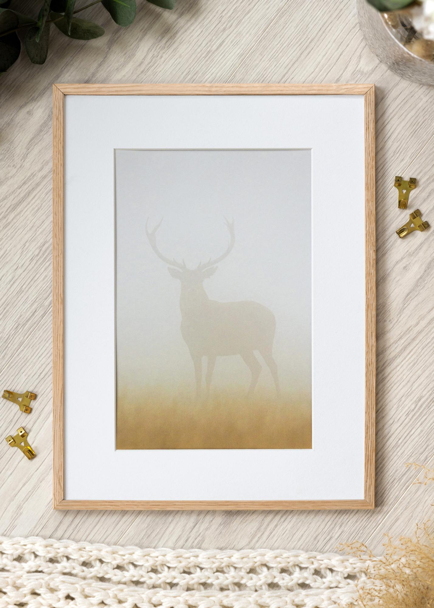 A moldura é feita de madeira de carvalho e tem um tom natural com uma superfície não tratada. Ela é equipada com vidro acrílico, cujas vantagens são ser leve e não estilhaçar - ao mesmo tempo em que possui a mesma nitidez clara do vidro comum!