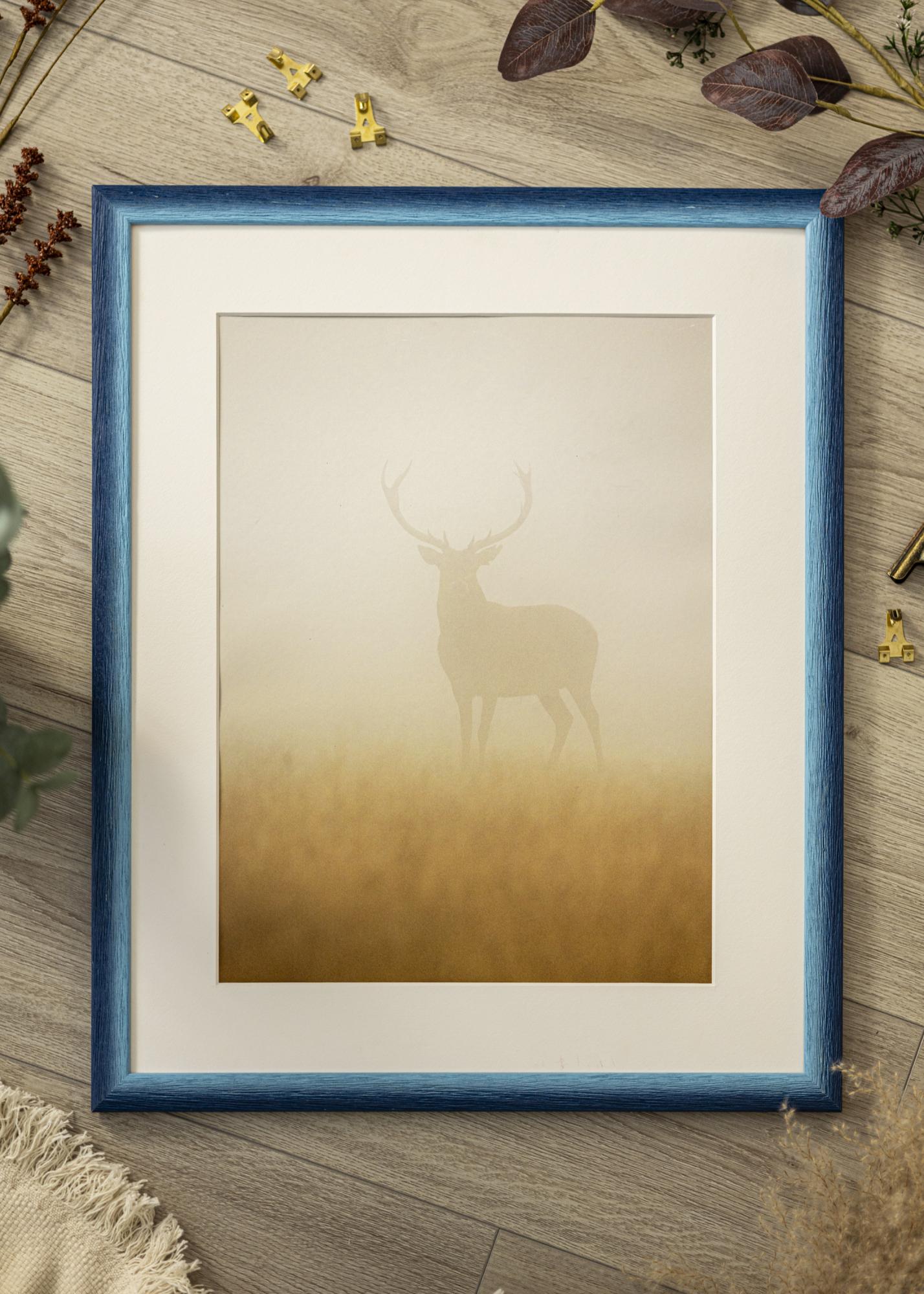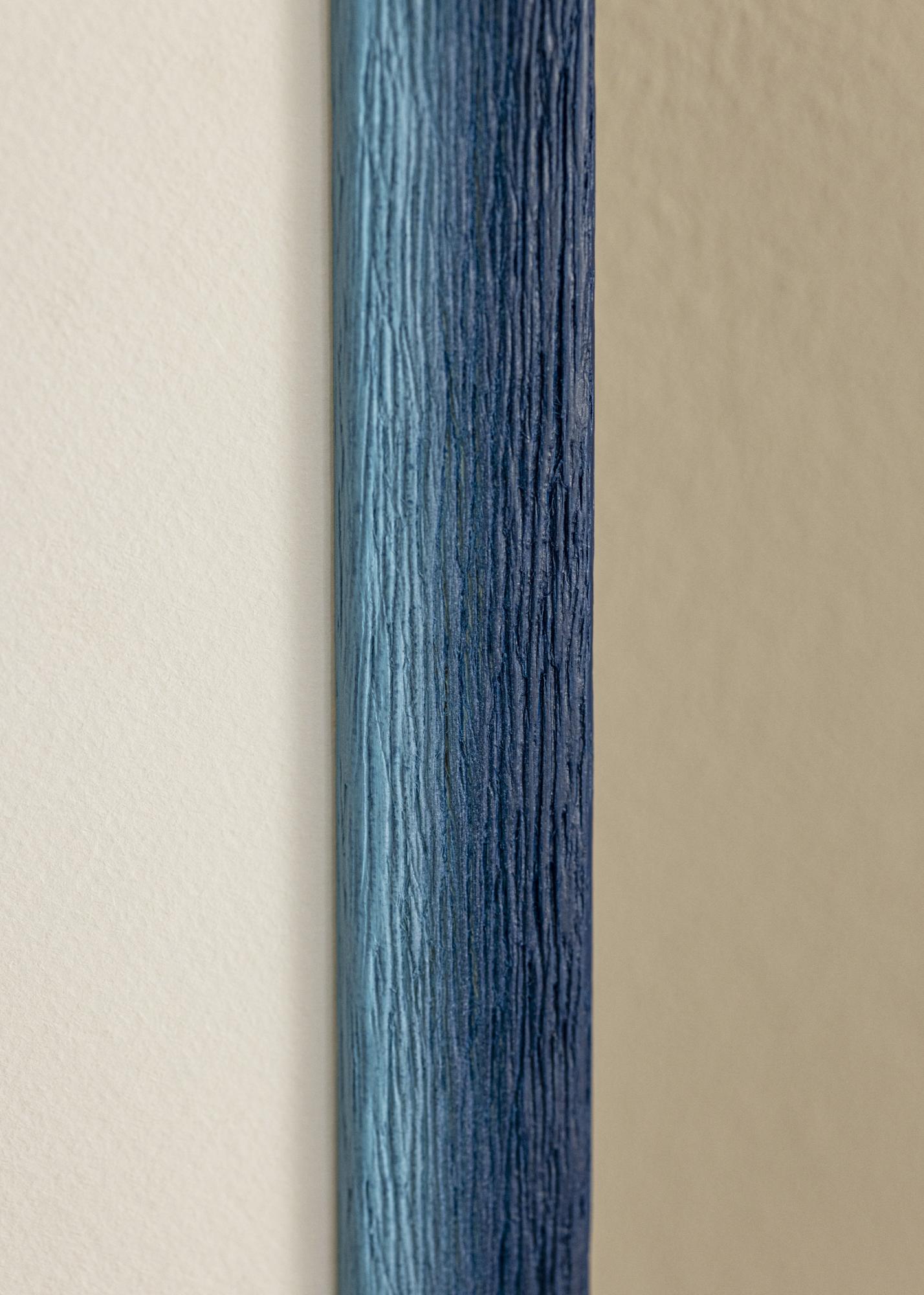 A moldura é feita de madeira ayos, o que proporciona uma sensação natural e rústica graças aos veios de madeira proeminentes. O tom azul profundo transita sutilmente para um tom mais claro ao longo das bordas, criando um efeito harmonioso e vibrante. O acabamento pintado à mão dá à moldura um caráter único, enquanto a superfície fosca reforça sua elegância atemporal.
