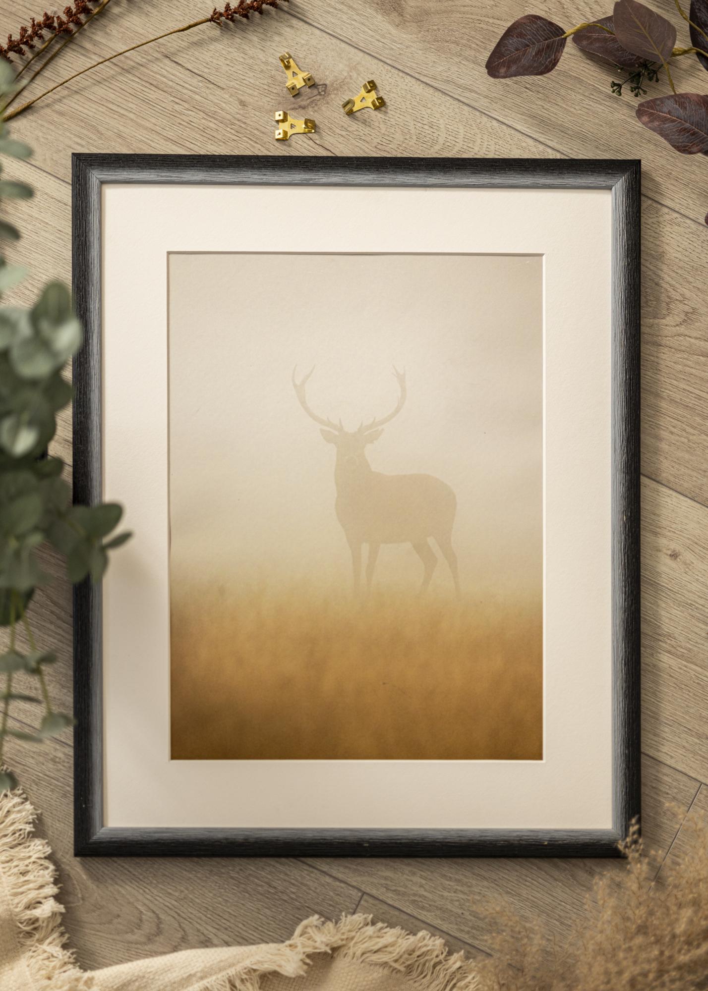 A moldura tem uma lista de 23 mm de largura e uma profundidade de 13 mm, o que confere um perfil estreito que contribui para uma estética moderna e atemporal. Feita de madeira ayous, a superfície possui um acabamento acetinado leve que proporciona um brilho sutil sem se tornar muito brilhante. Isso faz com que a moldura pareça tanto exclusiva quanto discreta simultaneamente.