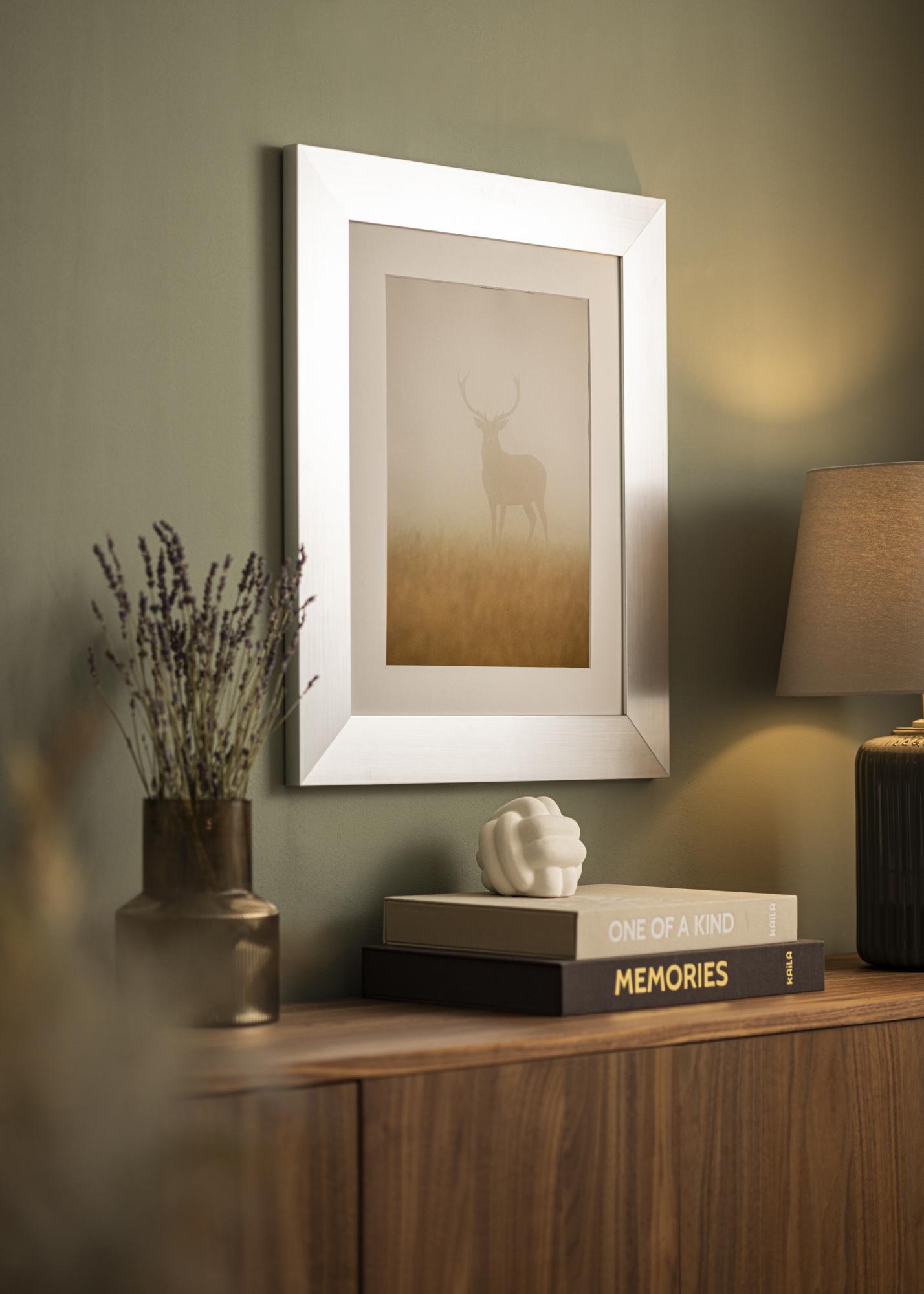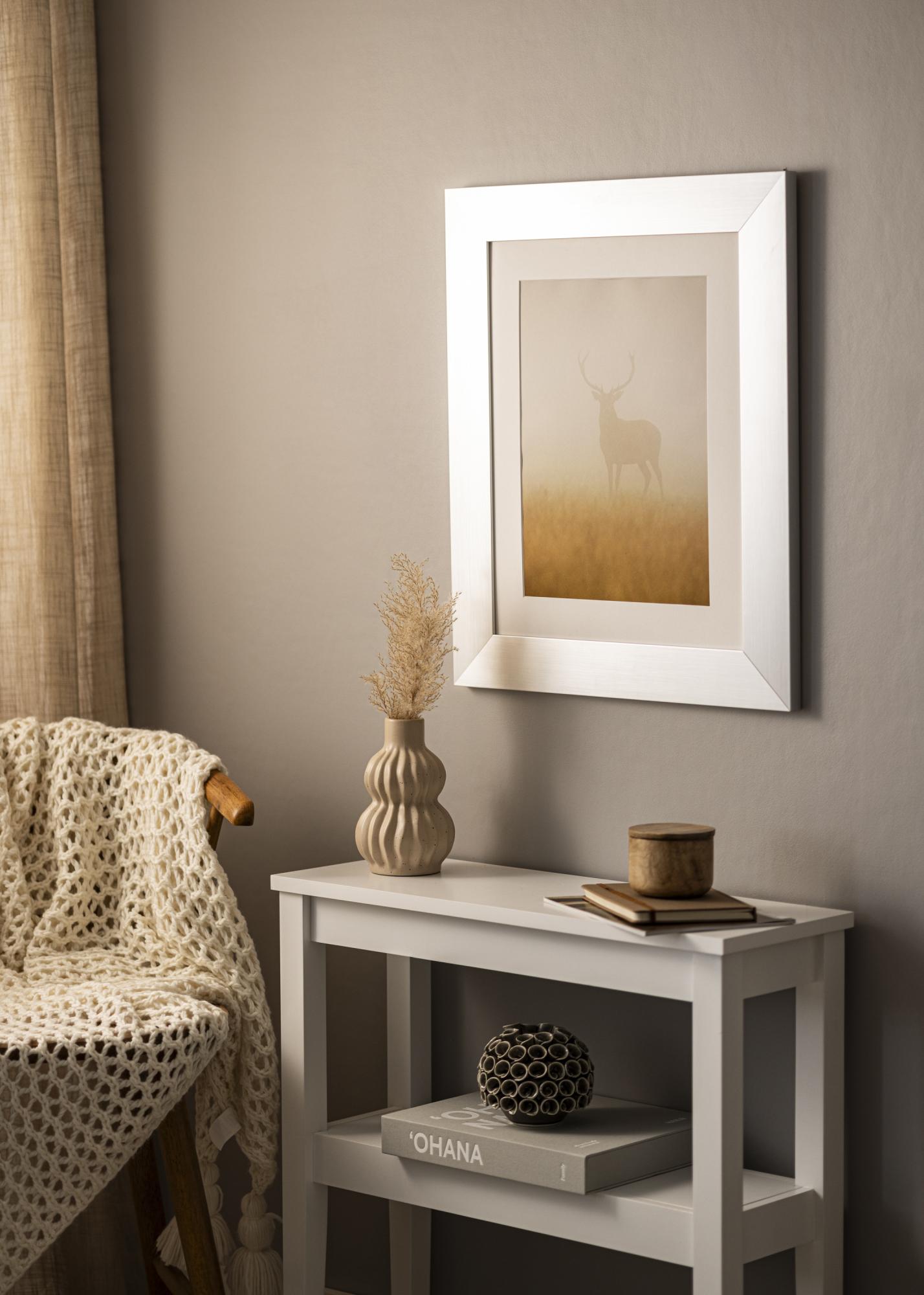 Esta moldura é feita de madeira de Ayos, o que proporciona uma construção durável e estável. A superfície de cor prata reflete a luz de uma maneira bonita e complementa tanto fotografias coloridas quanto imagens em preto e branco. Seja para exibir retratos de família, obras de arte ou momentos memoráveis, esta moldura dará às suas fotos a atenção que merecem.