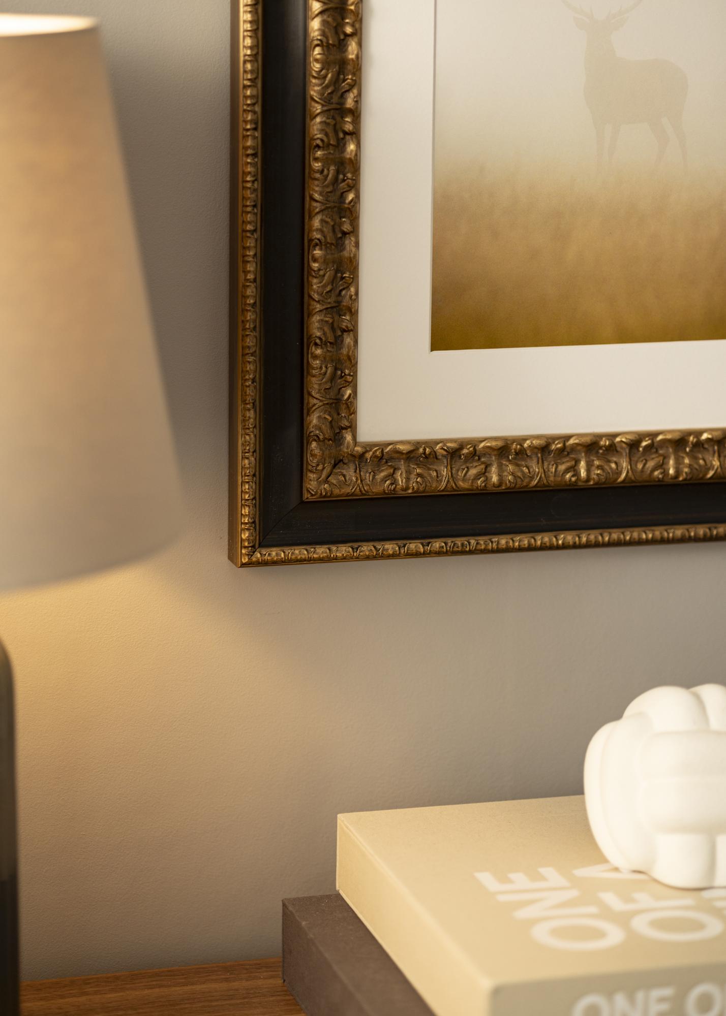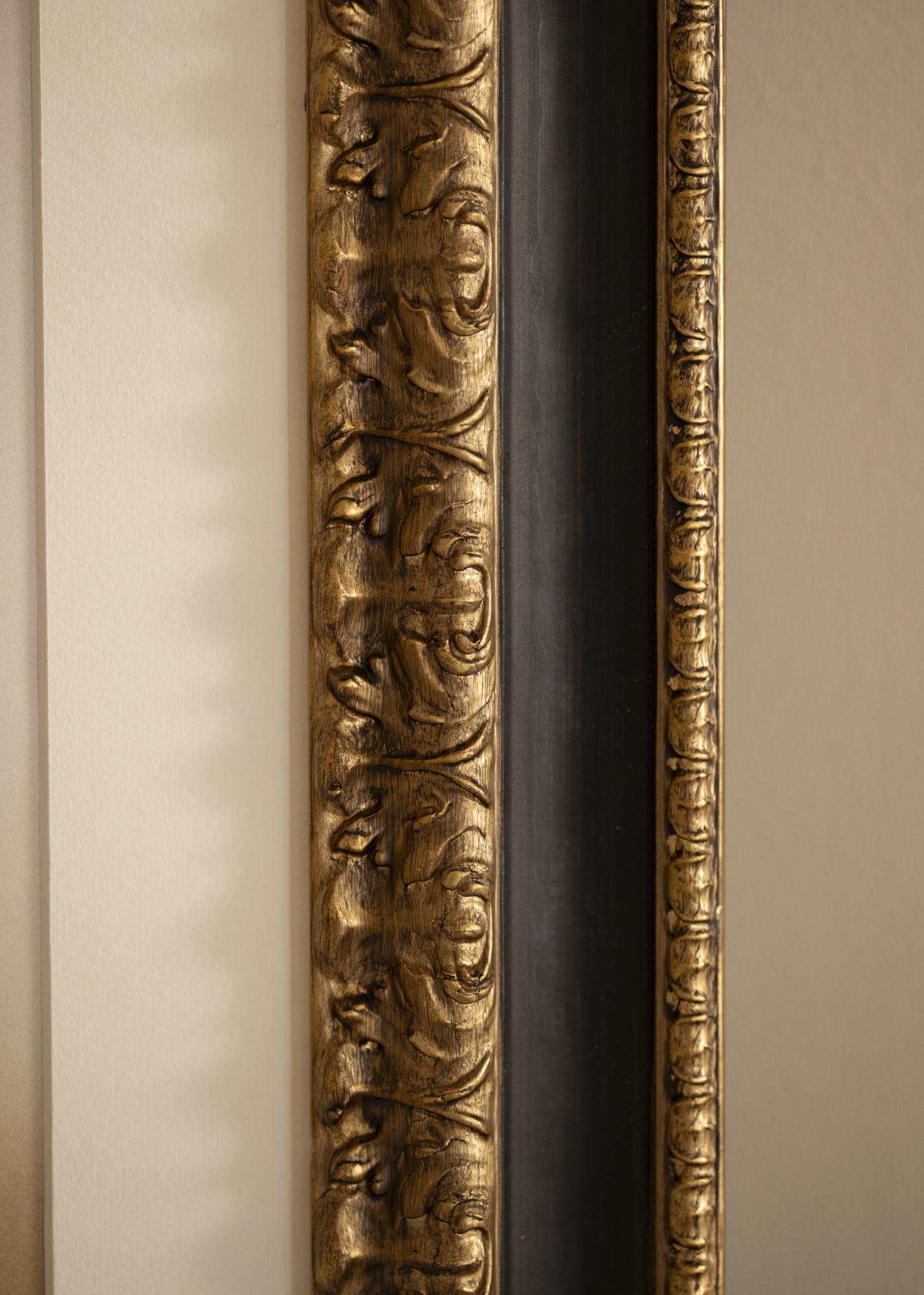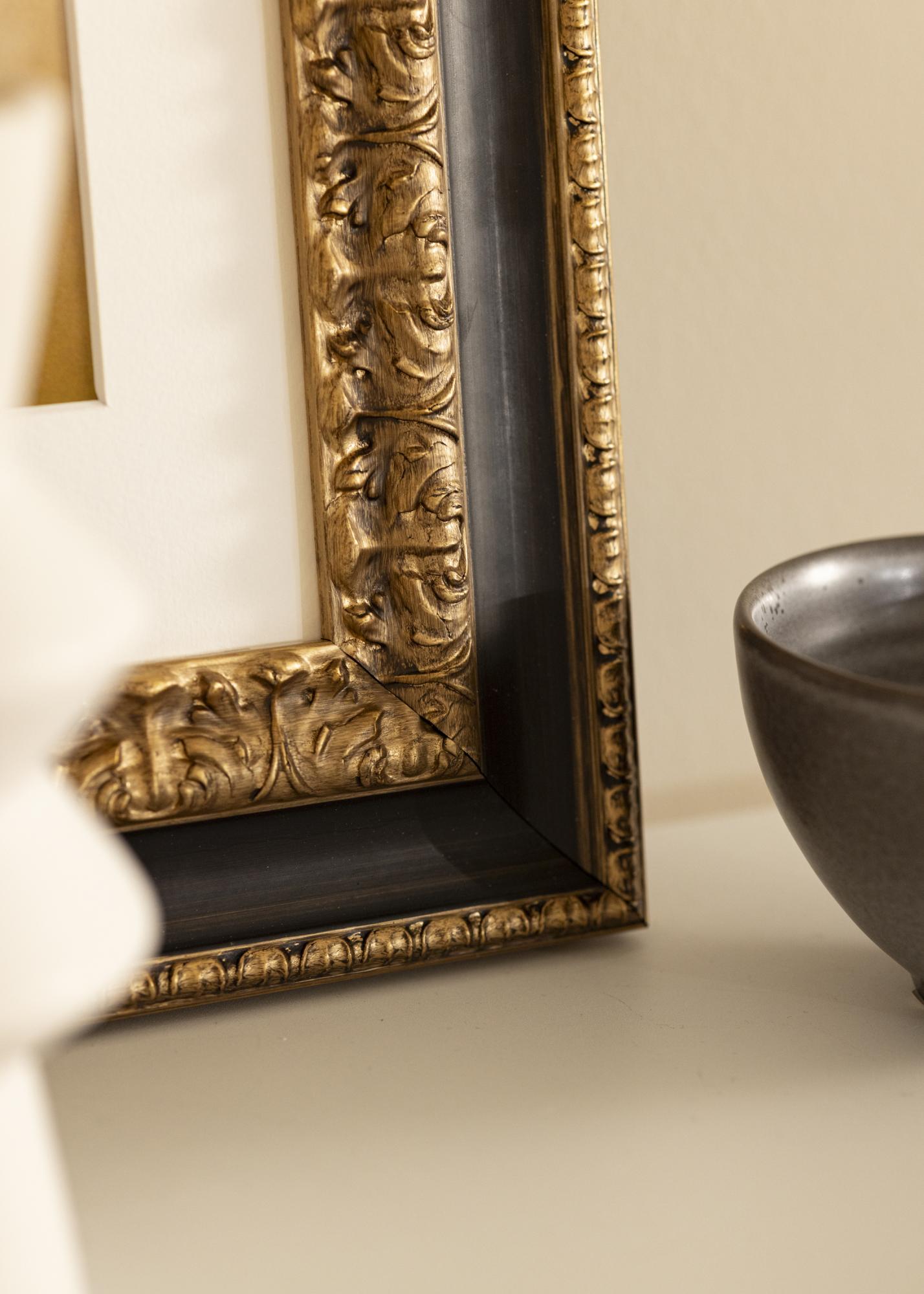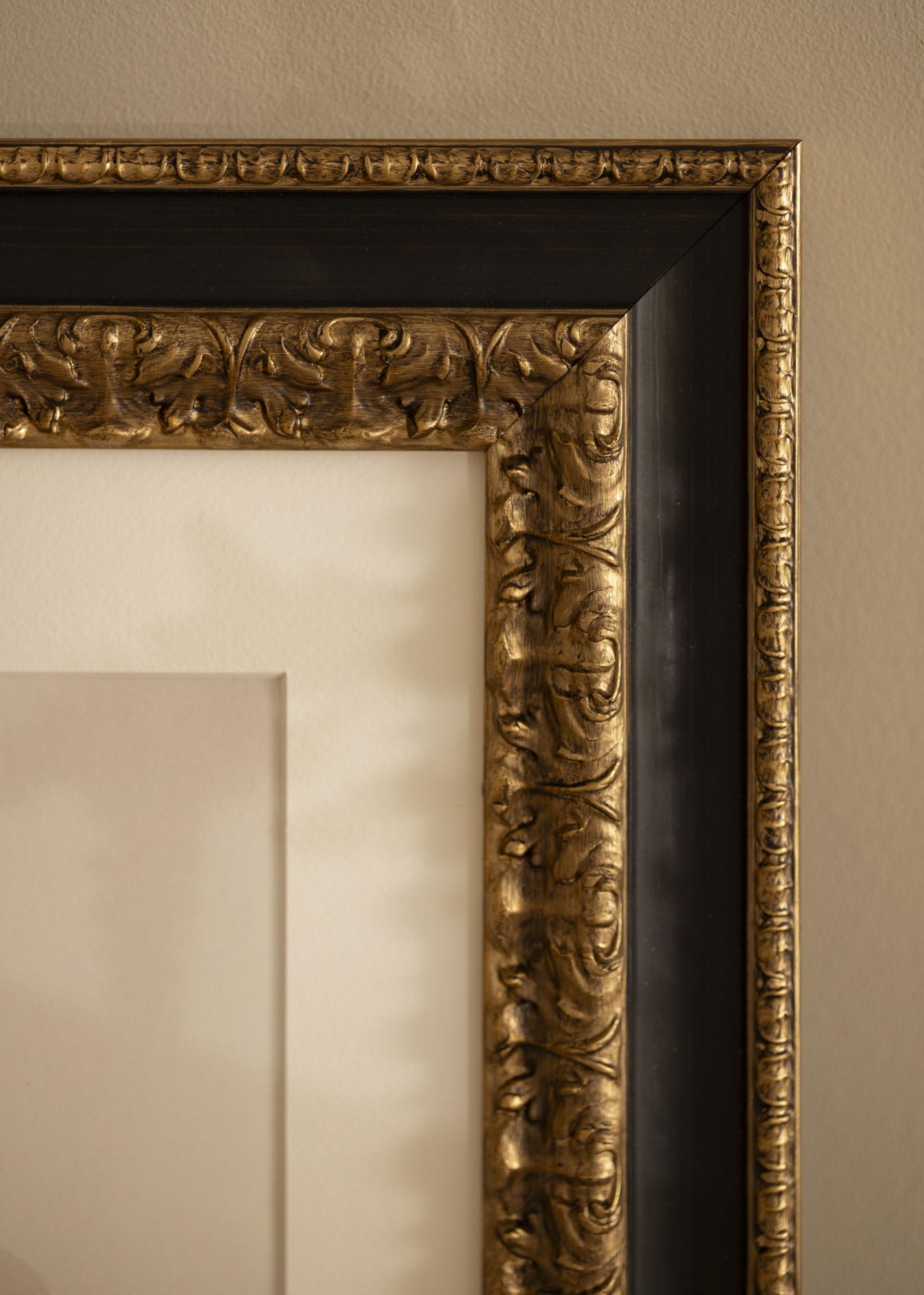 "Drottningholm Dourada" é uma bela moldura retro da Itália em pinho encaixado e pintado à mão. A moldura tem um perfil dourado ricamente decorado com uma borda preta larga que dá à moldura a sua sensação elegante. Perfeito para todos os tipos de emolduramentos em estilo retro.