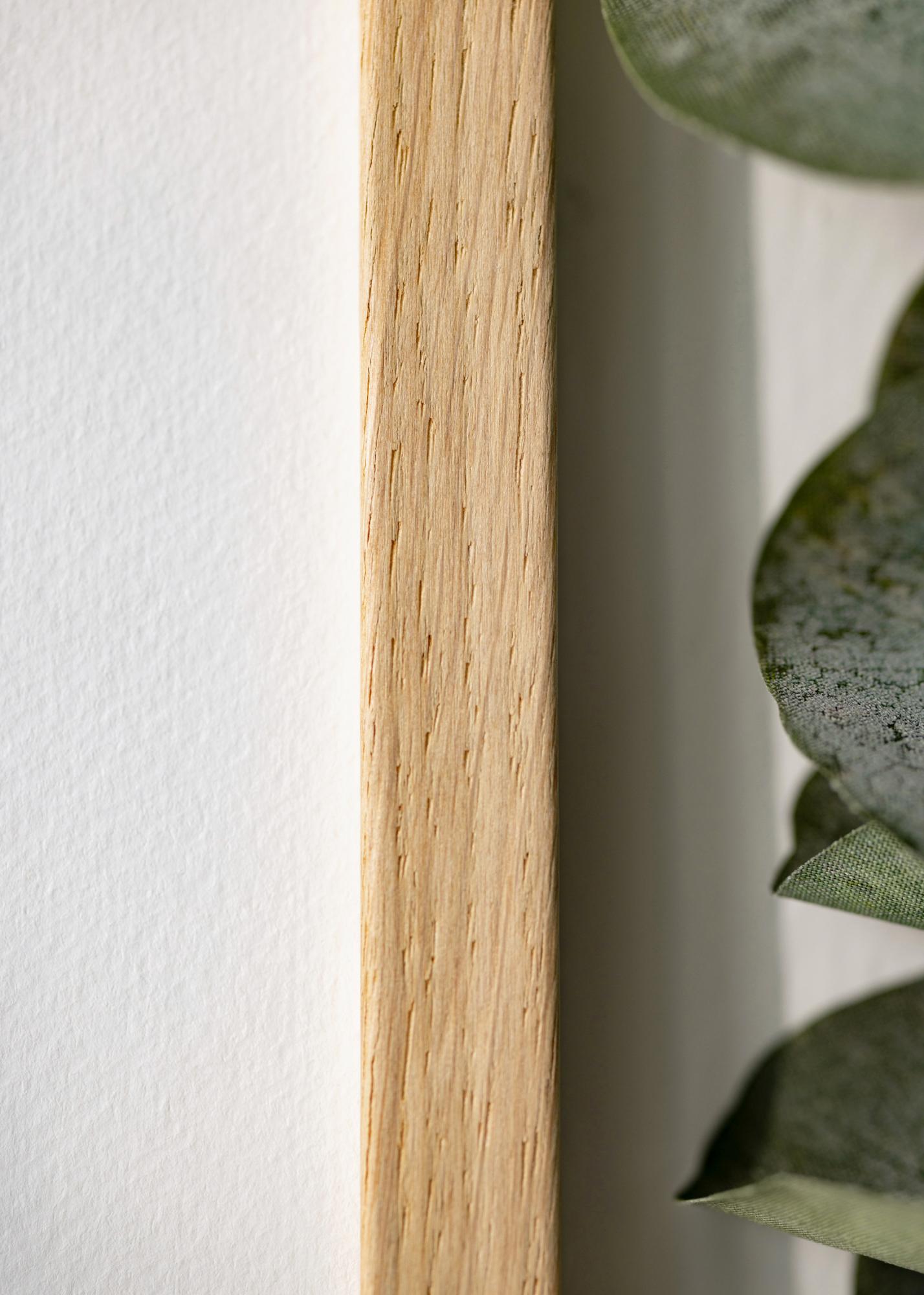 Às vezes, recebemos a pergunta de por que a moldura é feita de folheado de carvalho e não de carvalho maciço, se é para ser uma moldura de qualidade. A razão para isso é que é difícil obter uma superfície controlada quando se trata de carvalho maciço, pois muitas vezes há variações de cor em diferentes partes da madeira, o que em alguns contextos pode ser adequado. Mas numa moldura, isso só faria com que partes da moldura parecessem descoloridas.