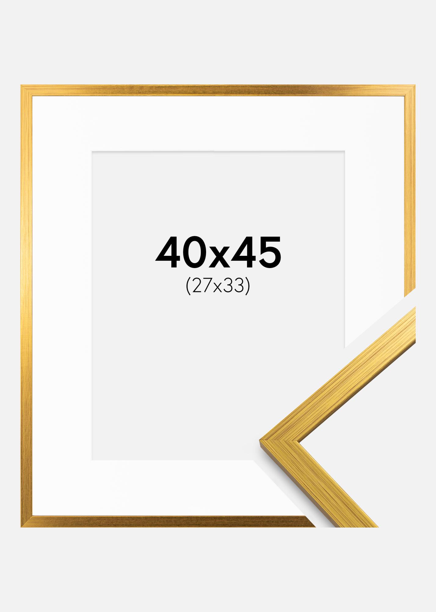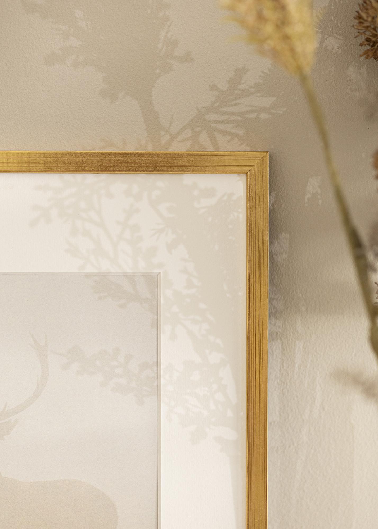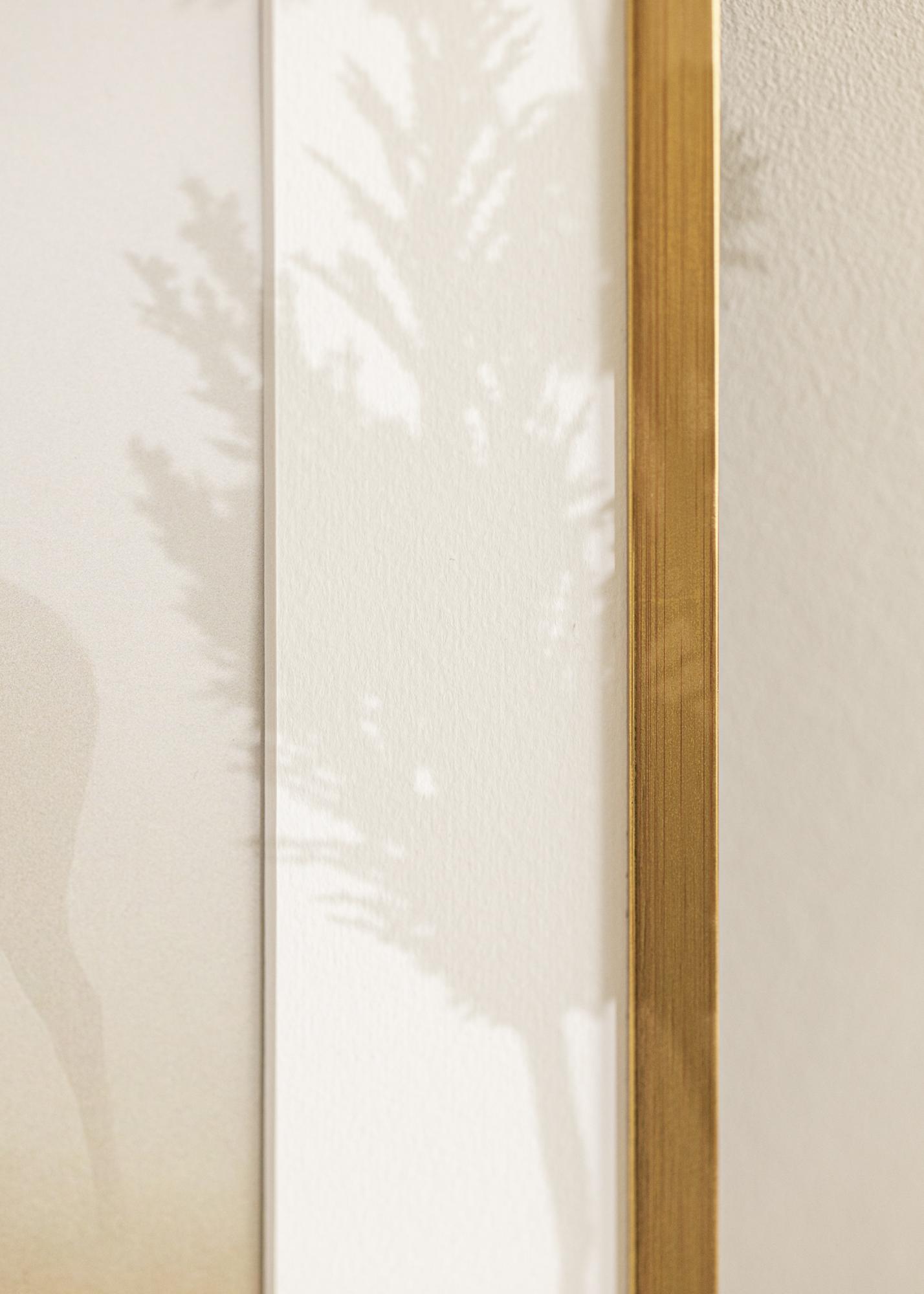 Transforme suas imagens em obras de arte com nossa elegante moldura dourada, completa com um passe-partout branco. Esta moldura é projetada para caber imagens no tamanho de 28x34 cm e oferece uma moldura sofisticada que destaca o motivo de forma estilosa. Com uma largura de 13 mm e uma profundidade de 11,5 mm, a moldura oferece um perfil fino e moderno que se encaixa perfeitamente em qualquer casa.