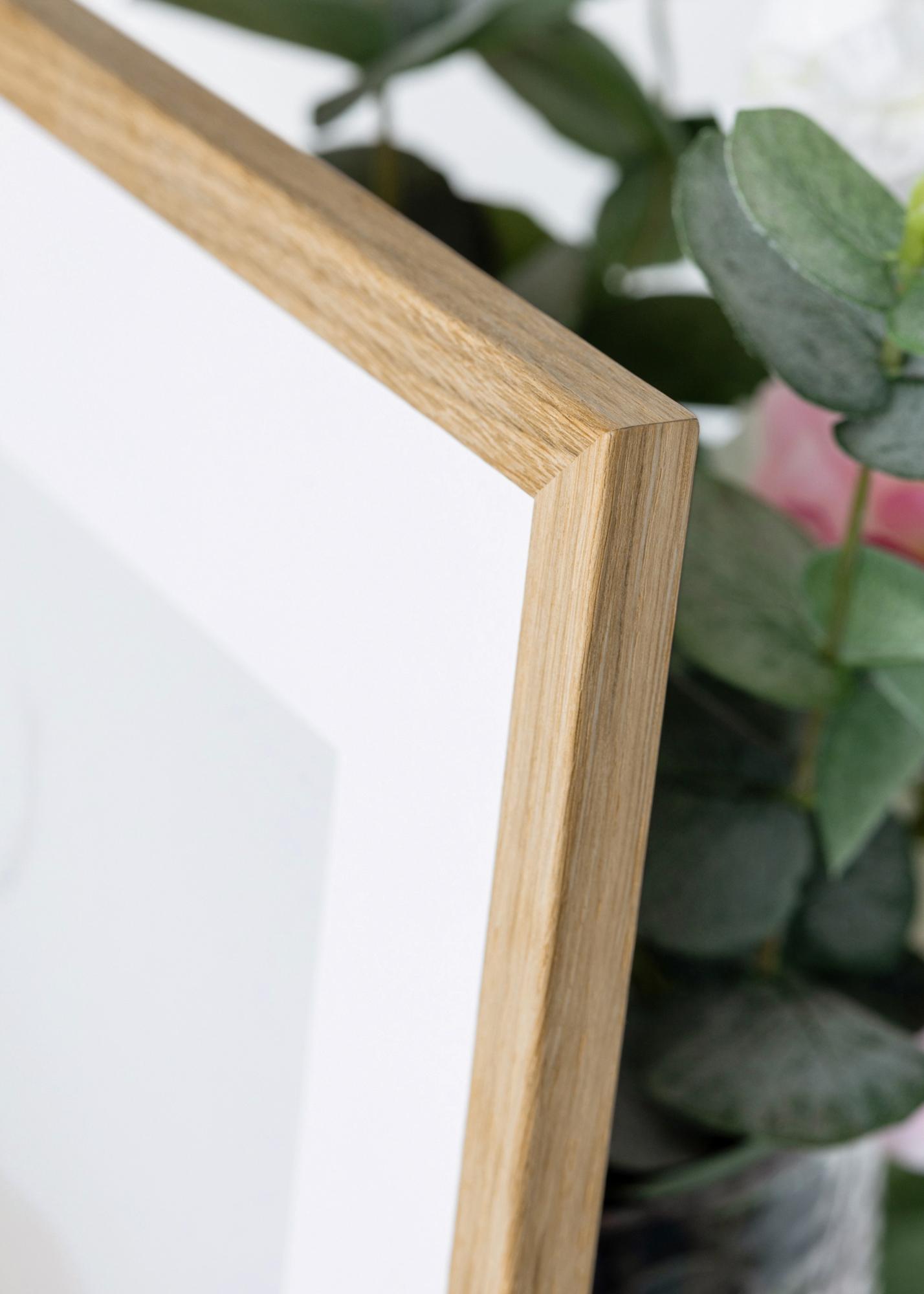 Às vezes, recebemos a pergunta de por que a moldura é feita de folheado de carvalho e não de carvalho maciço real, se ela é uma moldura de qualidade. A razão para isso é que é difícil obter uma superfície controlada quando se trata de carvalho real, pois geralmente há variações de cor em diferentes partes da madeira, o que em alguns contextos é adequado. Mas numa moldura, isso só faz com que pareça que partes da moldura estão descoloridas.