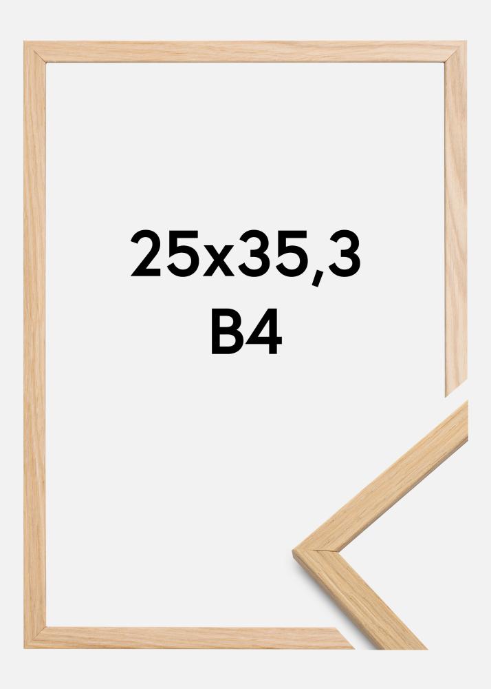 Às vezes, recebemos a pergunta de por que a moldura é feita de folheado de carvalho e não de carvalho maciço real, se ela é uma moldura de qualidade. A razão para isso é que é difícil obter uma superfície controlada quando se trata de carvalho real, pois geralmente há variações de cor em diferentes partes da madeira, o que em alguns contextos é adequado. Mas numa moldura, isso só faz com que pareça que partes da moldura estão descoloridas.