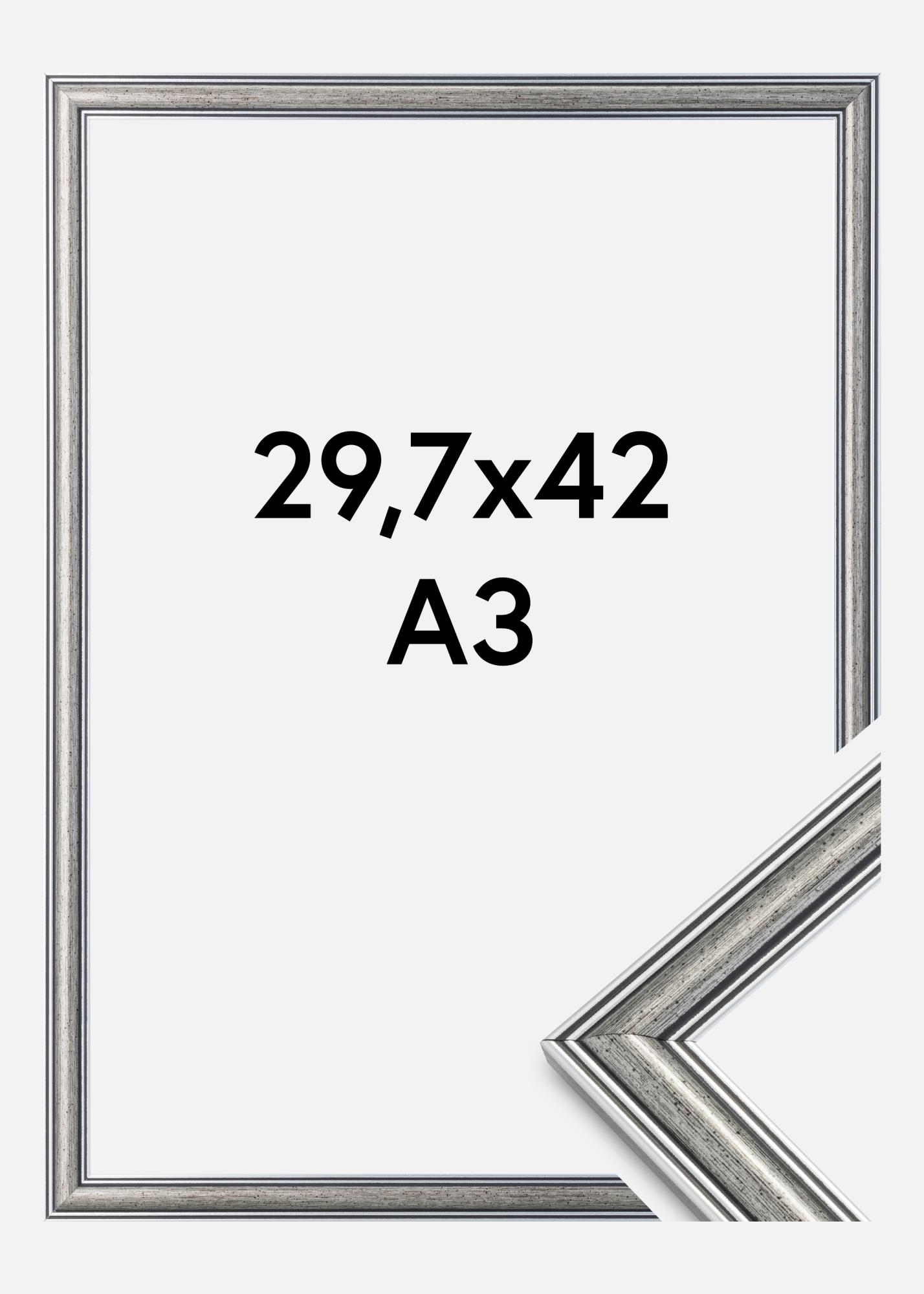 Frigg é uma moldura prateada com linhas pretas e detalhes pontilhados em preto. É perfeita quando procura uma moldura prateada tradicional e ampla que combine com vários tipos de imagens e ambientes.
