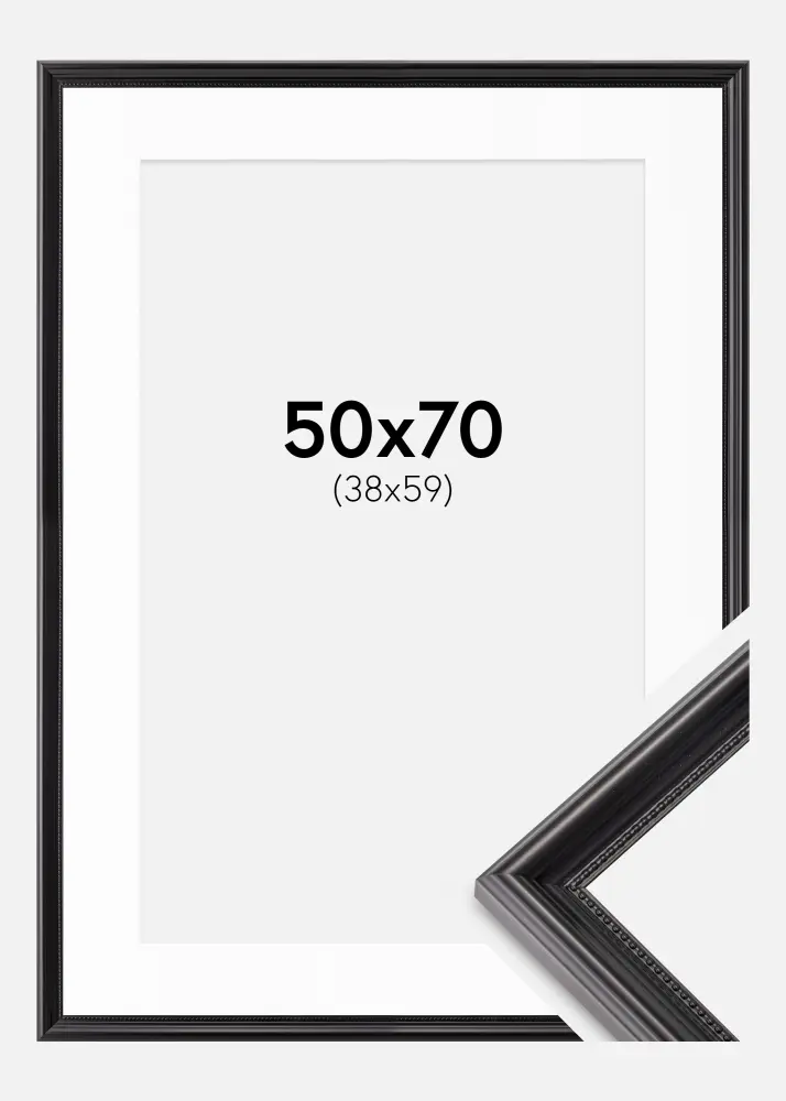 Passepartout se adapta a imagem de 39x60 cm. A cor da moldura é preta com uma largura de 20 mm e uma profundidade de 17 mm. As dimensões externas são 52,9x72,9 cm. A moldura tem um acabamento fosco e passe-partout branco.