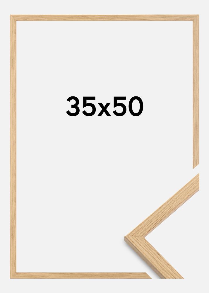 Esta é uma moldura fina que encaixa-se perfeitamente quando quer deixar todo o foco no motivo! A moldura tem 13 mm de profundidade e 13 mm de largura, o que significa que ela tem um design elegante, mas sólido. A moldura é feita de pinho e numa cor de carvalho. Na parte de trás, há suportes de parede para pendurar tanto na horizontal quanto na vertical.