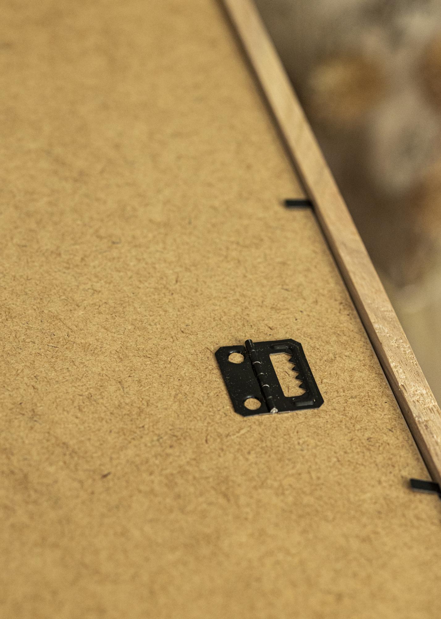 Na parte de trás, há uma placa de MDF que é mantida no lugar por pequenos pregos que pode dobrar para soltar a placa traseira e montar as suas imagens na moldura. A moldura pode ser montada na parede tanto na posição vertical quanto na horizontal.