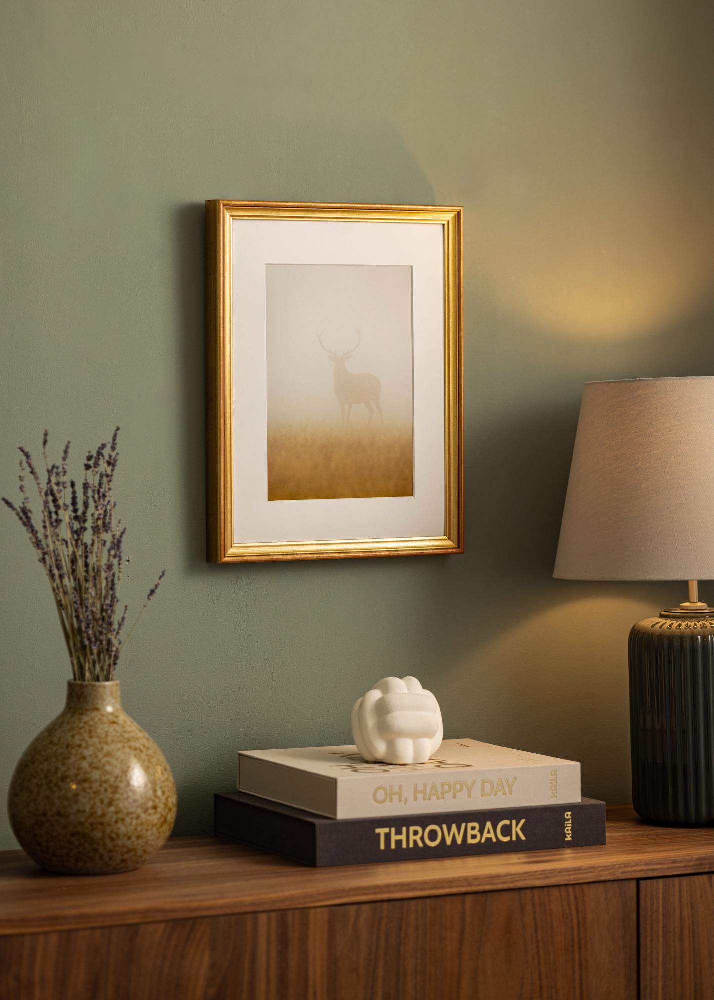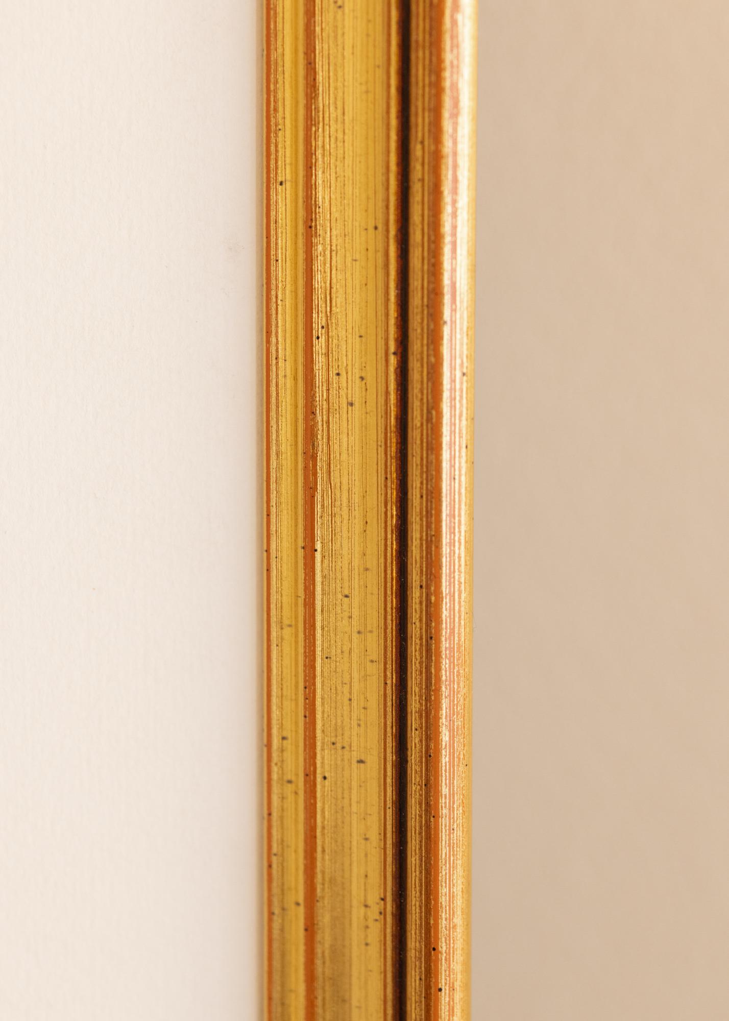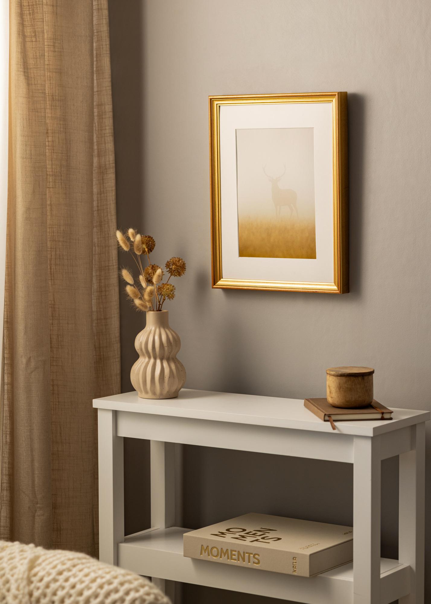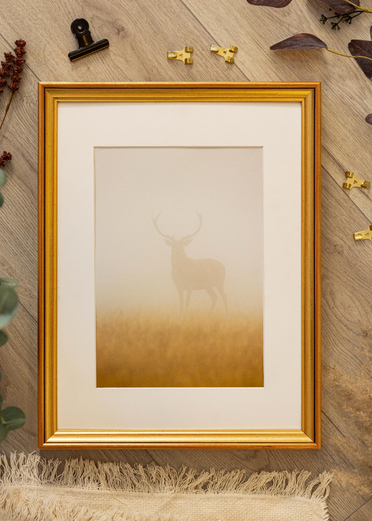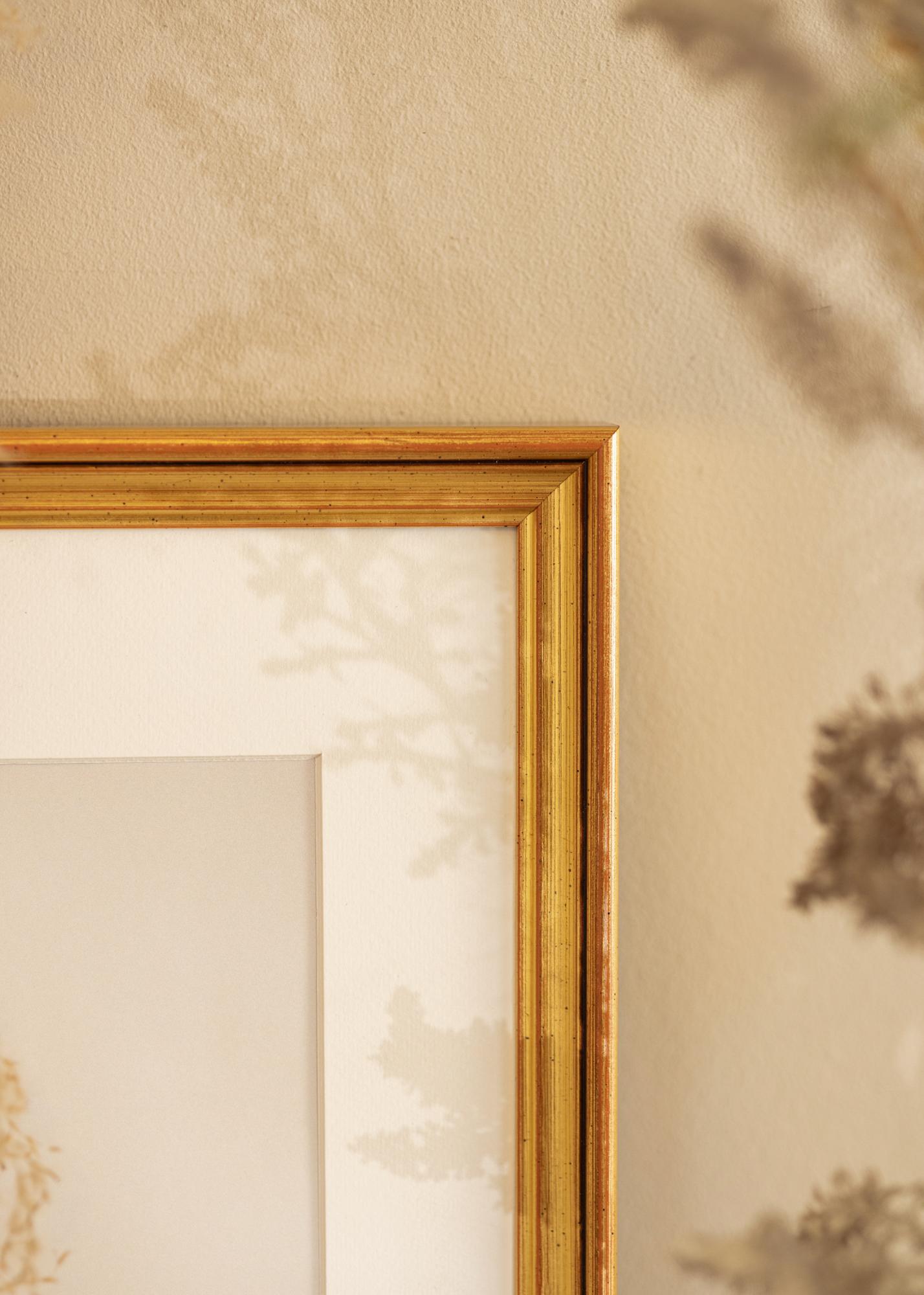 A Moldura Loki Ouro é uma moldura fotográfica elegante e clássica que proporciona às suas obras de arte e fotografias uma moldura sofisticada. Com seu perfil esguio e detalhes patinados sutis, esta moldura dourada oferece uma característica atemporal que se adapta perfeitamente a ambientes modernos e tradicionais. A superfície dourada possui um acabamento levemente antigo com pequenos detalhes escuros, o que realça seu aspecto elegante e cria uma sensação de profundidade e história.