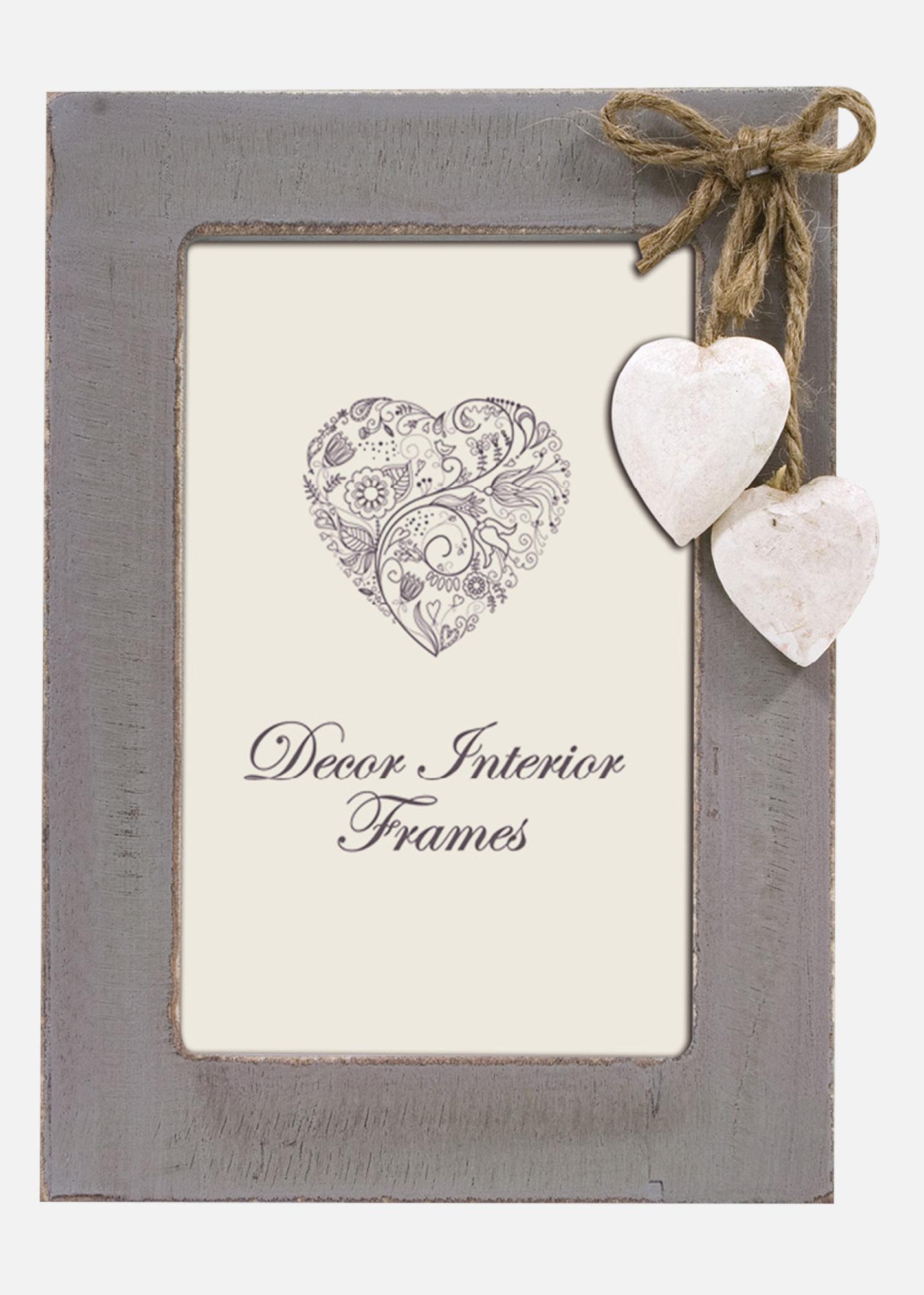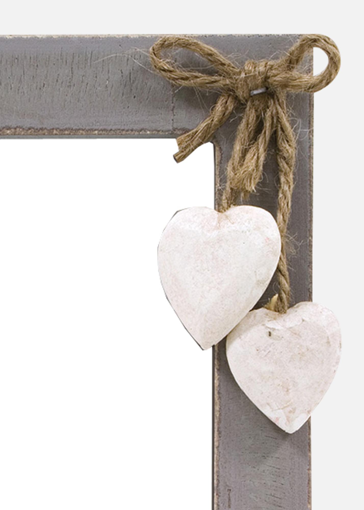 Uma encantadora moldura fotográfica com um toque rústico em um acabamento acinzentado. Decorada com dois pingentes em formato de coração de madeira e uma corda natural para um toque romântico e campestre. Perfeita para destacar suas memórias mais queridas e criar uma atmosfera acolhedora no lar.