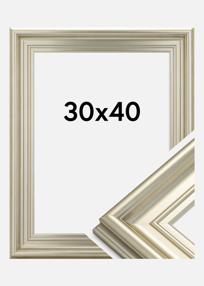 Mora Premium Prateada é uma das nossas molduras de prata mais finas. Feita de madeira das nossas belas florestas suecas e montada na nossa própria oficina de molduras. Isso nos permite garantir uma qualidade excecional. A moldura tem um perfil suavemente prateado em estilo antigo pintado, com uma largura de impressionantes 57 mm. Perfeito para as suas melhores fotos!
