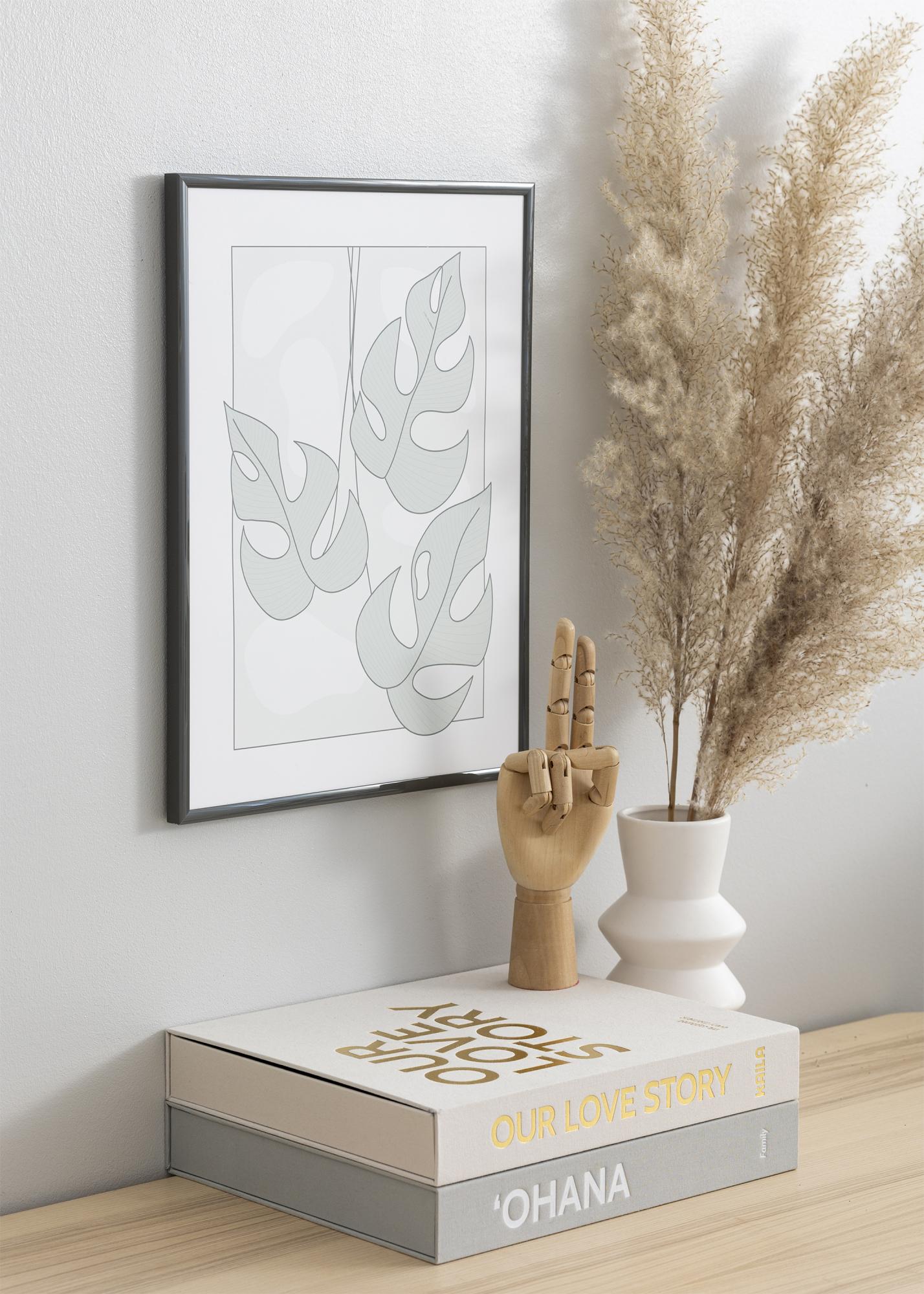 A moldura é feita com acrílico - uma variante de vidro com muitas vantagens. O acrílico é leve e à prova de quebra! As molduras podem ser penduradas na parede com parafuso e prego, mas tamanhos de moldura de até 50x70 cm também podem ser montados com penduradores adesivos para quadros.