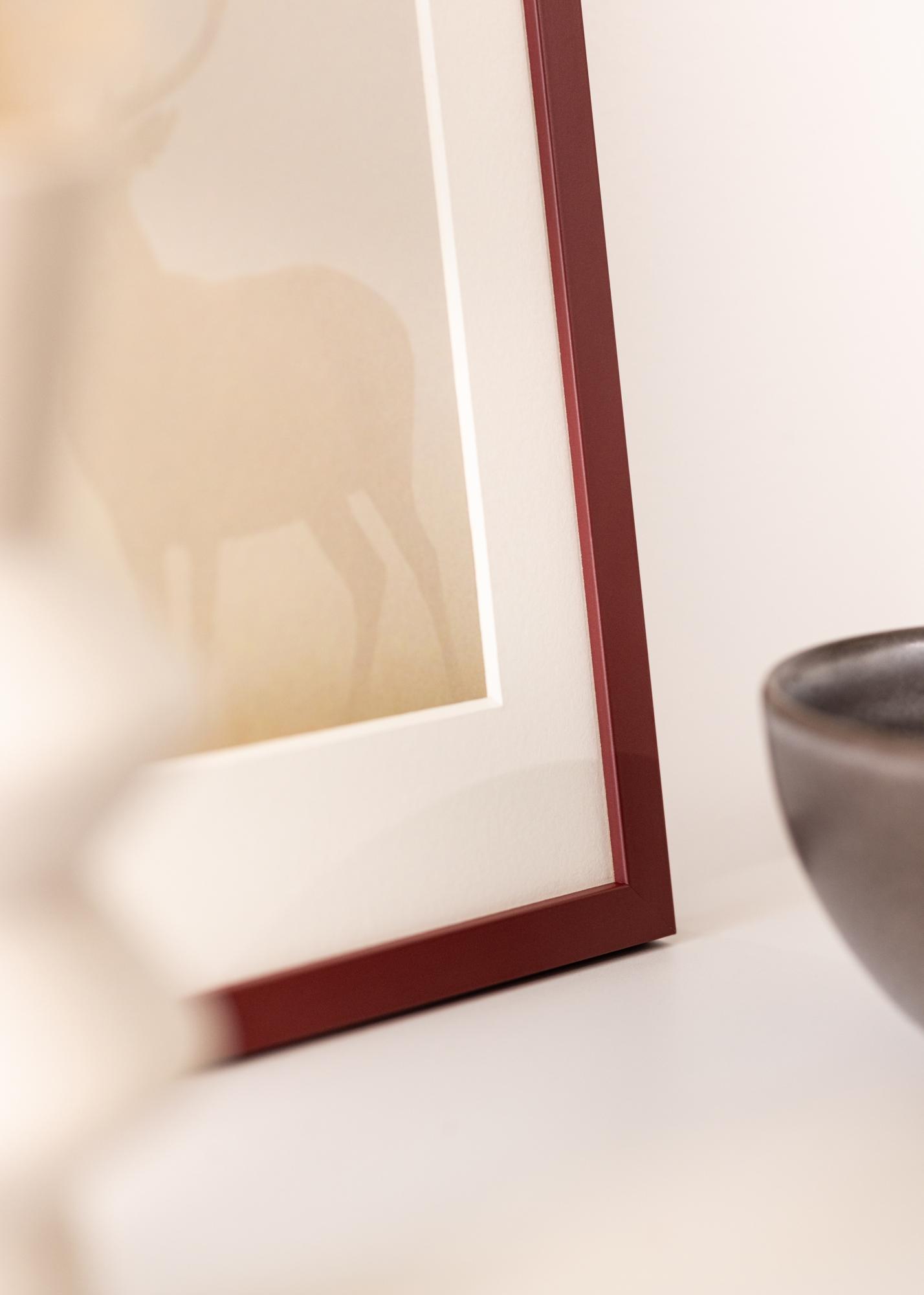 Uma moldura elegante com um perfil quadrado moderno, onde tanto a largura da moldura quanto a profundidade da moldura medem 15 mm. A moldura é da série NordicLine da empresa dinamarquesa Incado e possui um design moderno e minimalista com as suas linhas retas. A moldura é feita de madeira e foi revestida com um acabamento mate em um tom elegante de vinho tinto, o que proporciona uma moldura impactante para a sua imagem.