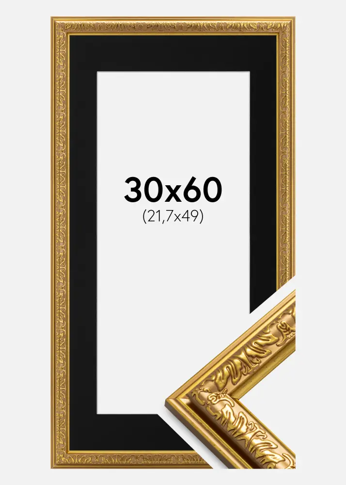 Moldura Nostalgia Dourado 30x60 cm - Passe-partout Preto 22,7x50 cm