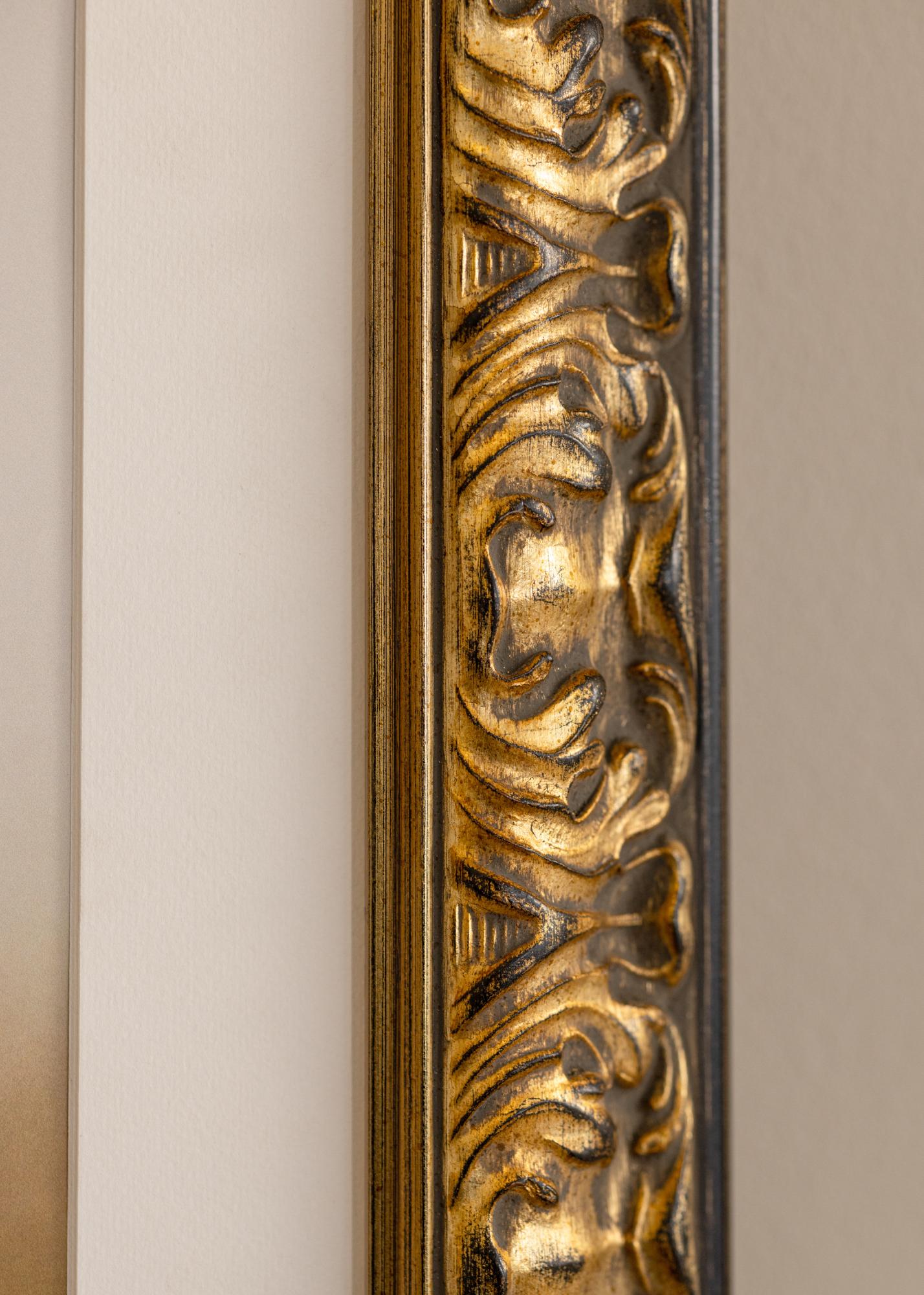 Nosso quadro sob medida Odin em ouro e preto é a escolha perfeita para quem busca uma moldura elegante e clássica. Com seu acabamento dourado e detalhes em preto, esta moldura oferece uma sensação antiga que realça qualquer obra de arte ou fotografia. O design ornamentado cria um belo contraste entre o ouro quente e os detalhes pretos profundos, proporcionando um visual elegante e tradicional.