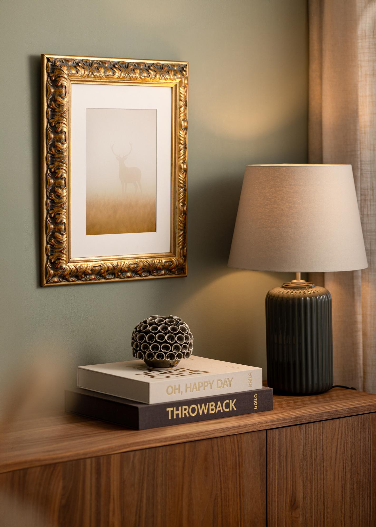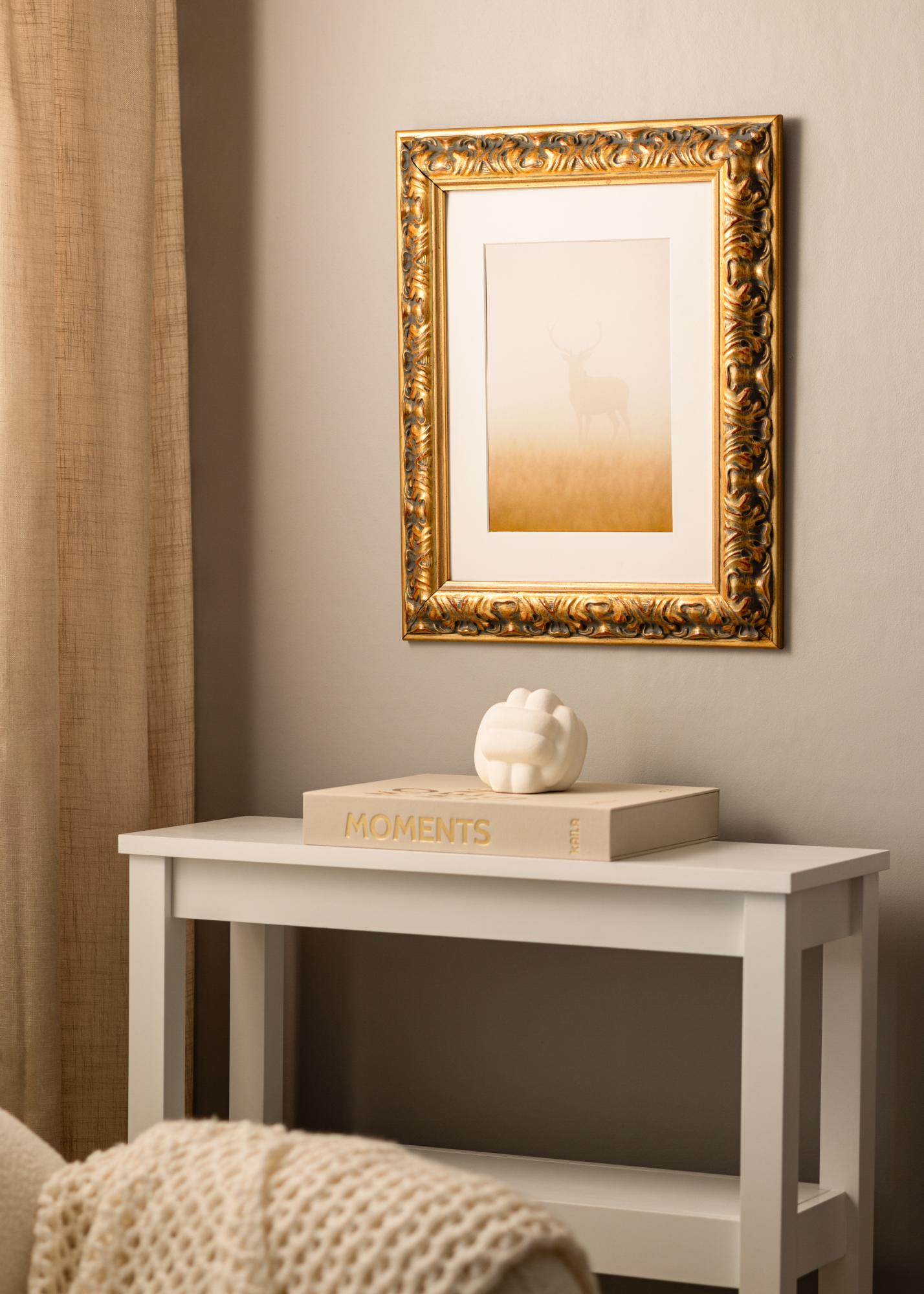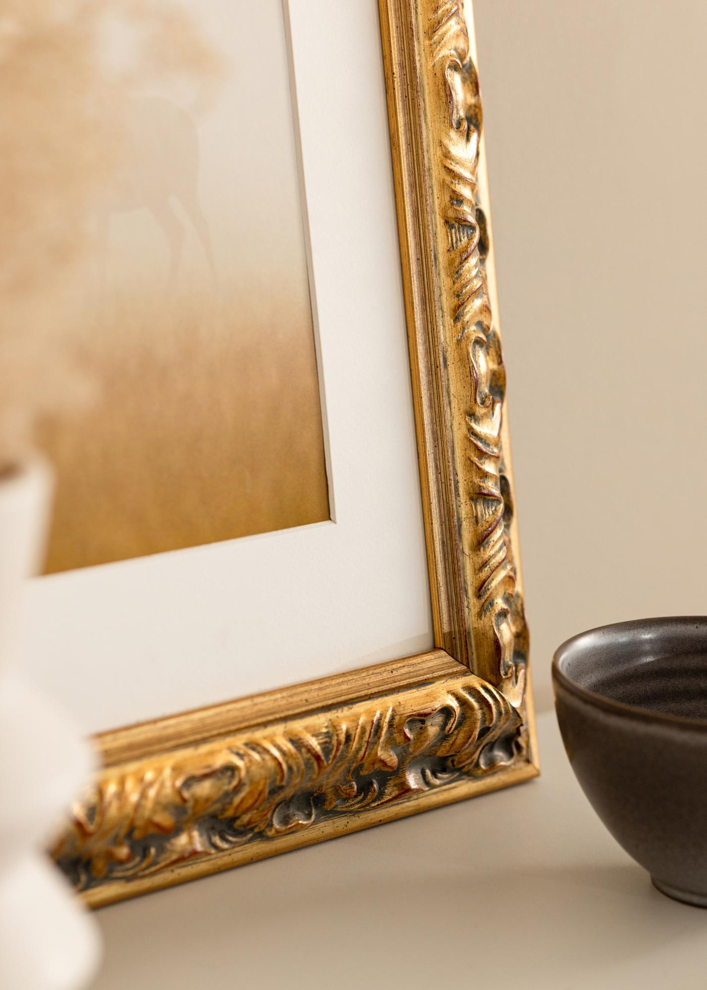 A moldura, com 64 mm de largura, é feita de pinho e tem uma profundidade de 38,5 mm, o que confere à moldura uma sensação robusta e sólida. Os padrões esculpidos em relevo são destacados por um contraste sutil entre ouro e acentos escuros, enquanto os elementos vermelhos distintos dão profundidade e caráter ao conjunto. A combinação desses elementos cria um estilo barroco que se adapta tanto a interiores clássicos quanto modernos.