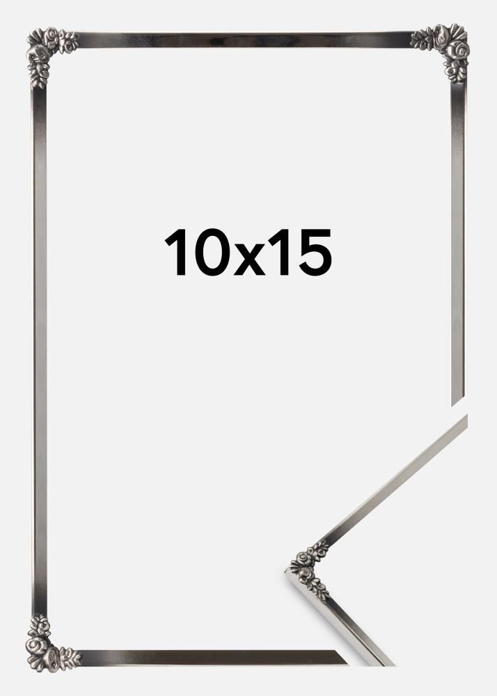 Rosen Metall Prateada é uma moldura em estilo clássico, onde cada canto é decorado com pequenas rosas elegantes. A moldura é feita de metal prateado e tem um acabamento levemente "queimado" que ajuda a criar uma sensação extra elegante. Na parte de trás, há suportes de parede e suporte traseiro, o que permite que a moldura seja colocada na parede ou como decoração num móvel.