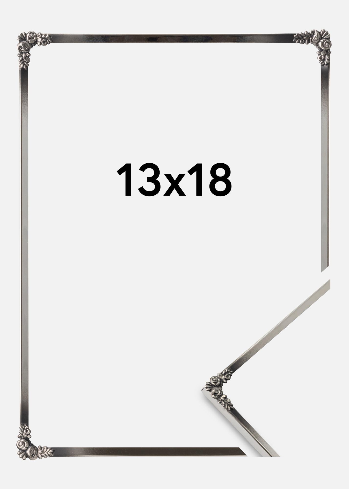 Rosen Metall Prateada é uma moldura em estilo clássico, onde cada canto é decorado com pequenas rosas elegantes. A moldura é feita de metal prateado e tem um acabamento levemente "queimado" que ajuda a criar uma sensação extra elegante. Na parte de trás, há suportes de parede e suporte traseiro, o que permite que a moldura seja colocada na parede ou como decoração num móvel.