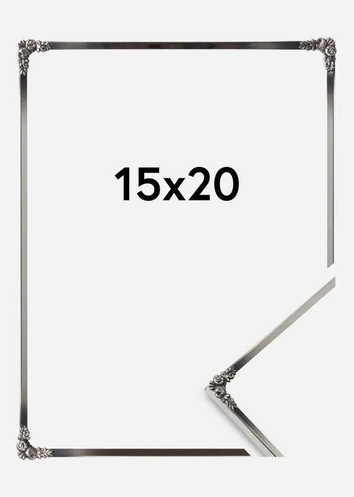 Rosen Metall Prateada é uma moldura em estilo clássico, onde cada canto é decorado com pequenas rosas elegantes. A moldura é feita de metal prateado e tem um acabamento levemente "queimado" que ajuda a criar uma sensação extra elegante. Na parte de trás, há suportes de parede e suporte traseiro, o que permite que a moldura seja colocada na parede ou como decoração num móvel.