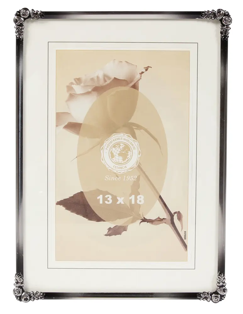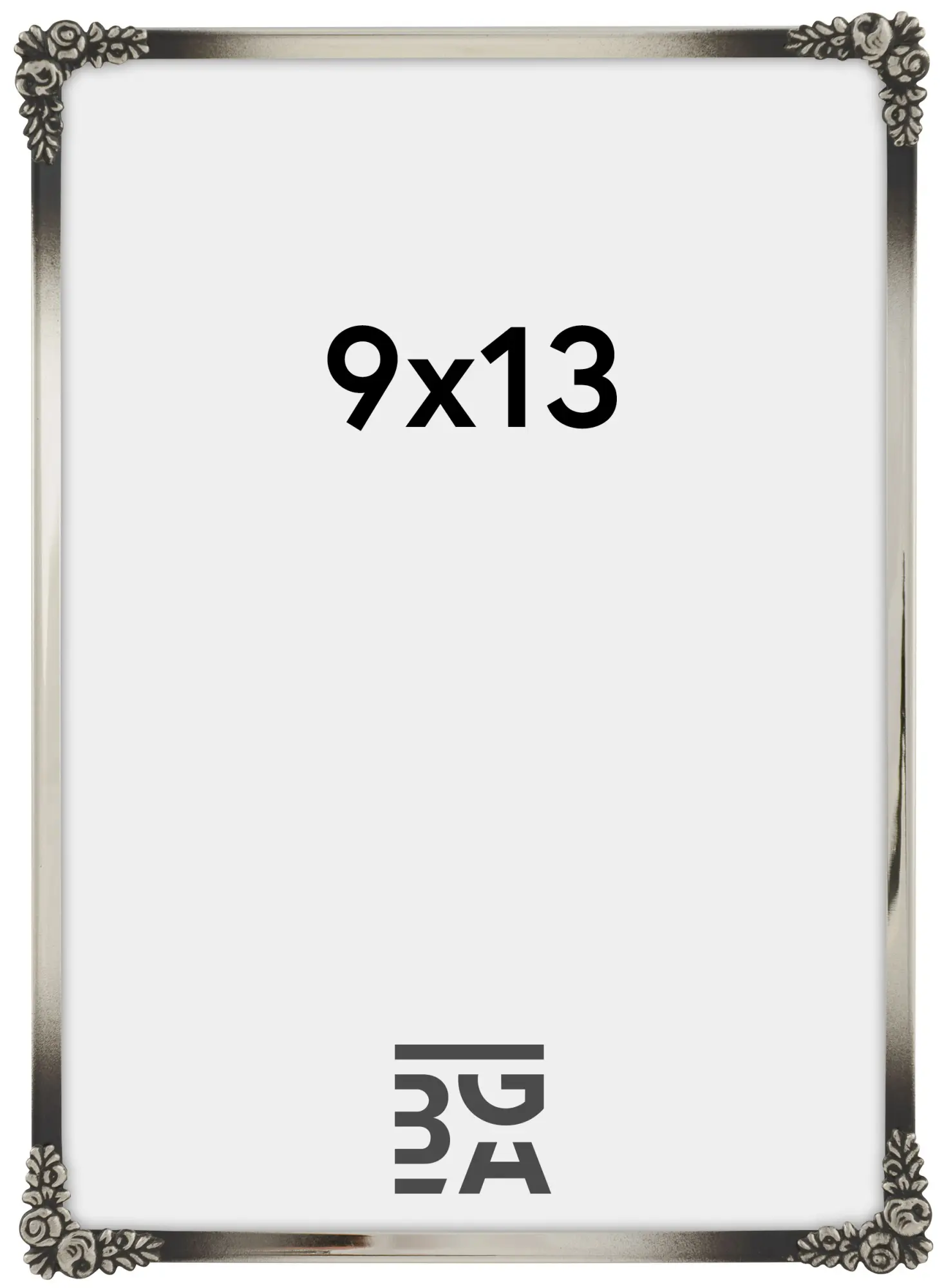Rosen Metall Prateada é uma moldura em estilo clássico, onde cada canto é decorado com pequenas rosas elegantes. A moldura é feita de metal prateado e tem um acabamento levemente "queimado" que ajuda a criar uma sensação extra elegante. Na parte de trás, há suportes de parede e suporte traseiro, o que permite que a moldura seja colocada na parede ou como decoração num móvel.