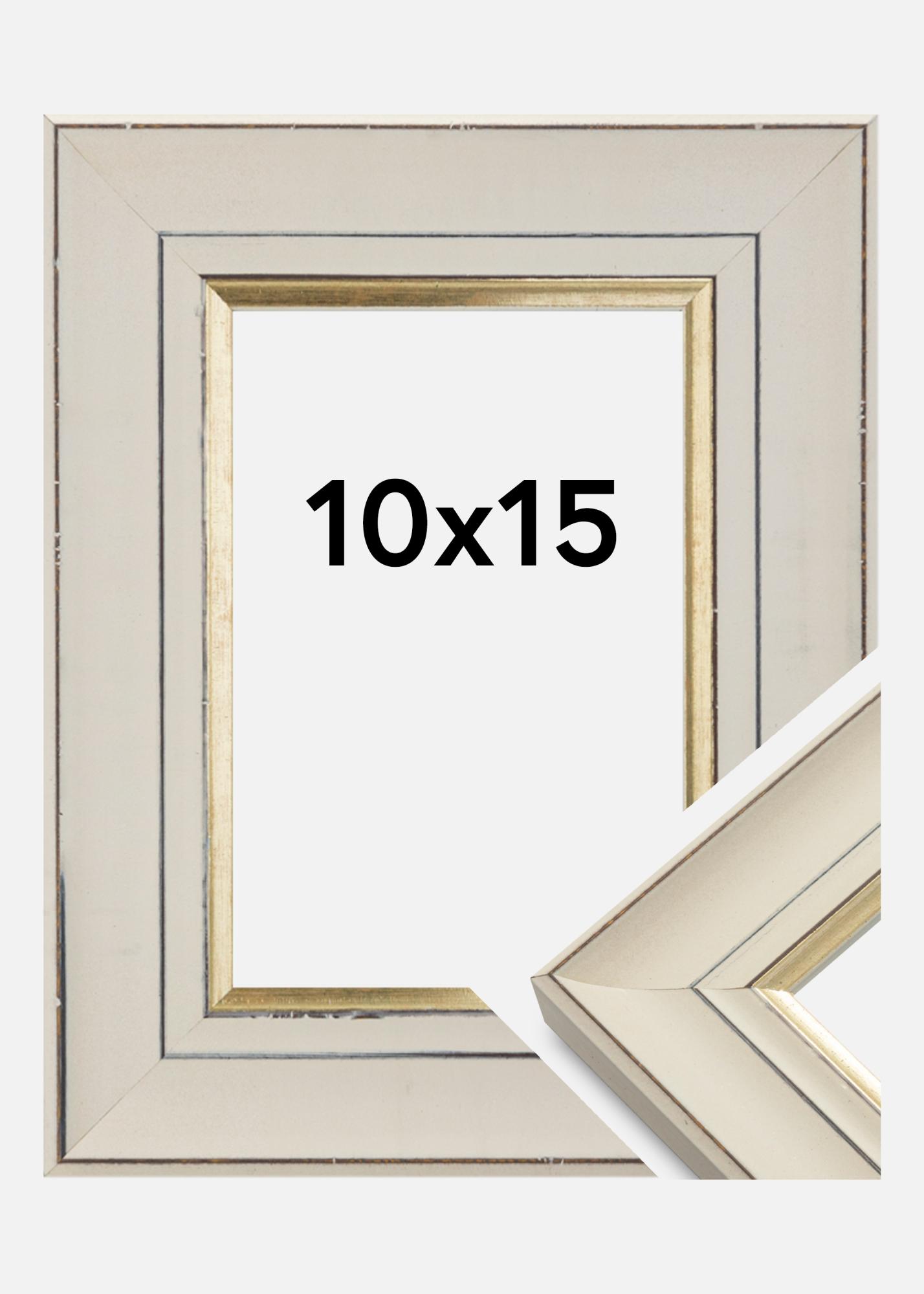 Porta-retrato em estilo clássico com uma emocionante sensação retro. A moldura tem um perfil gasto em branco com uma elegante borda dourada próxima à imagem, com o seu design neutro e escolha de cores, este é um porta-retrato que se adequa a quase todos os ambientes e a todos os tipos de imagens.