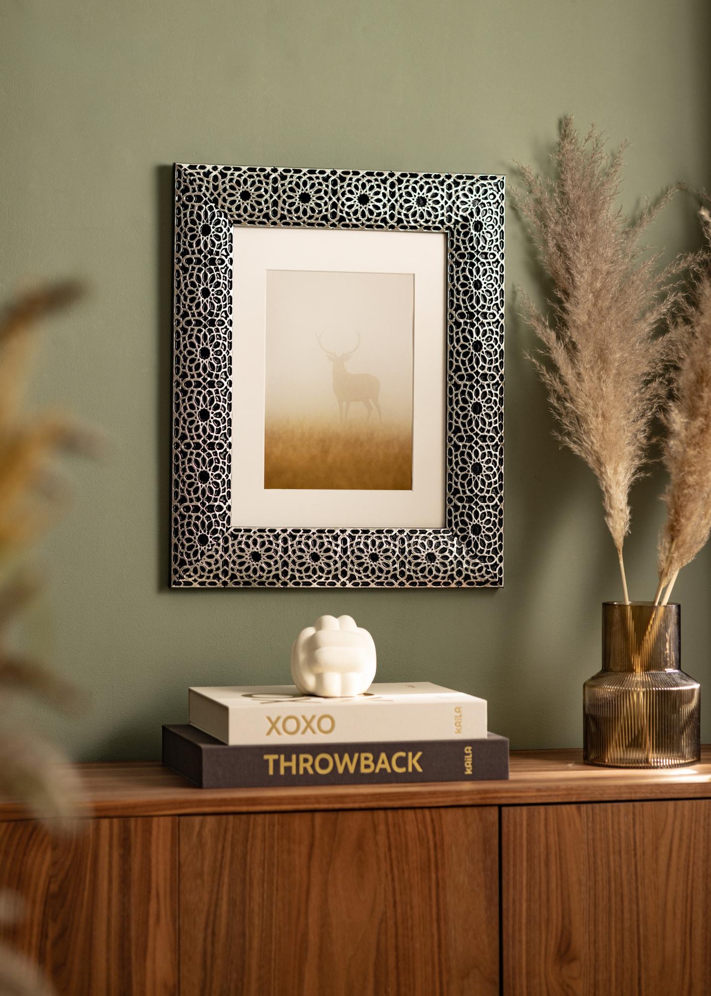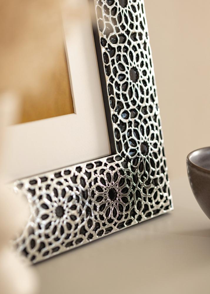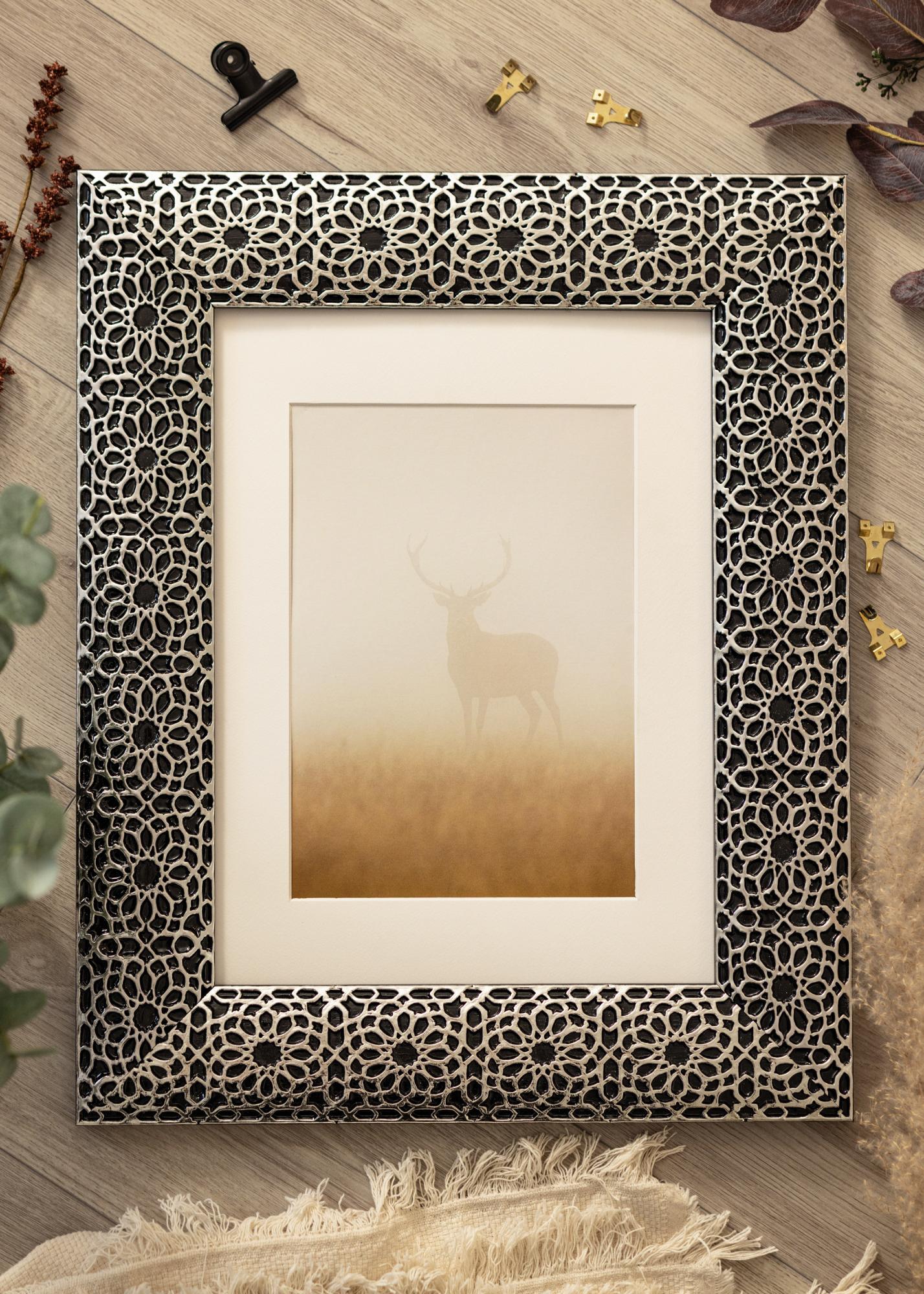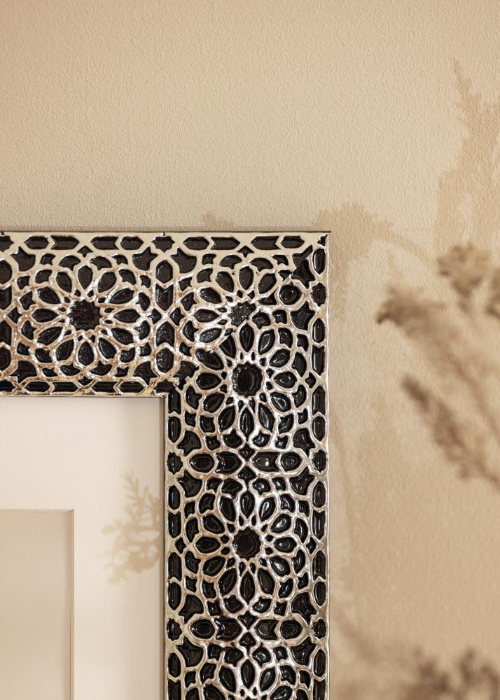 "Stockholm Preta" é melhor descrito como luxo e elegância no seu melhor. Com o seu design luxuoso e único em preto e com revestimento de prata ornamentado, esta é uma moldura para aqueles que realmente desejam algo único e que se destaque! Perfeito para retratos grandes e fotos de casamento.