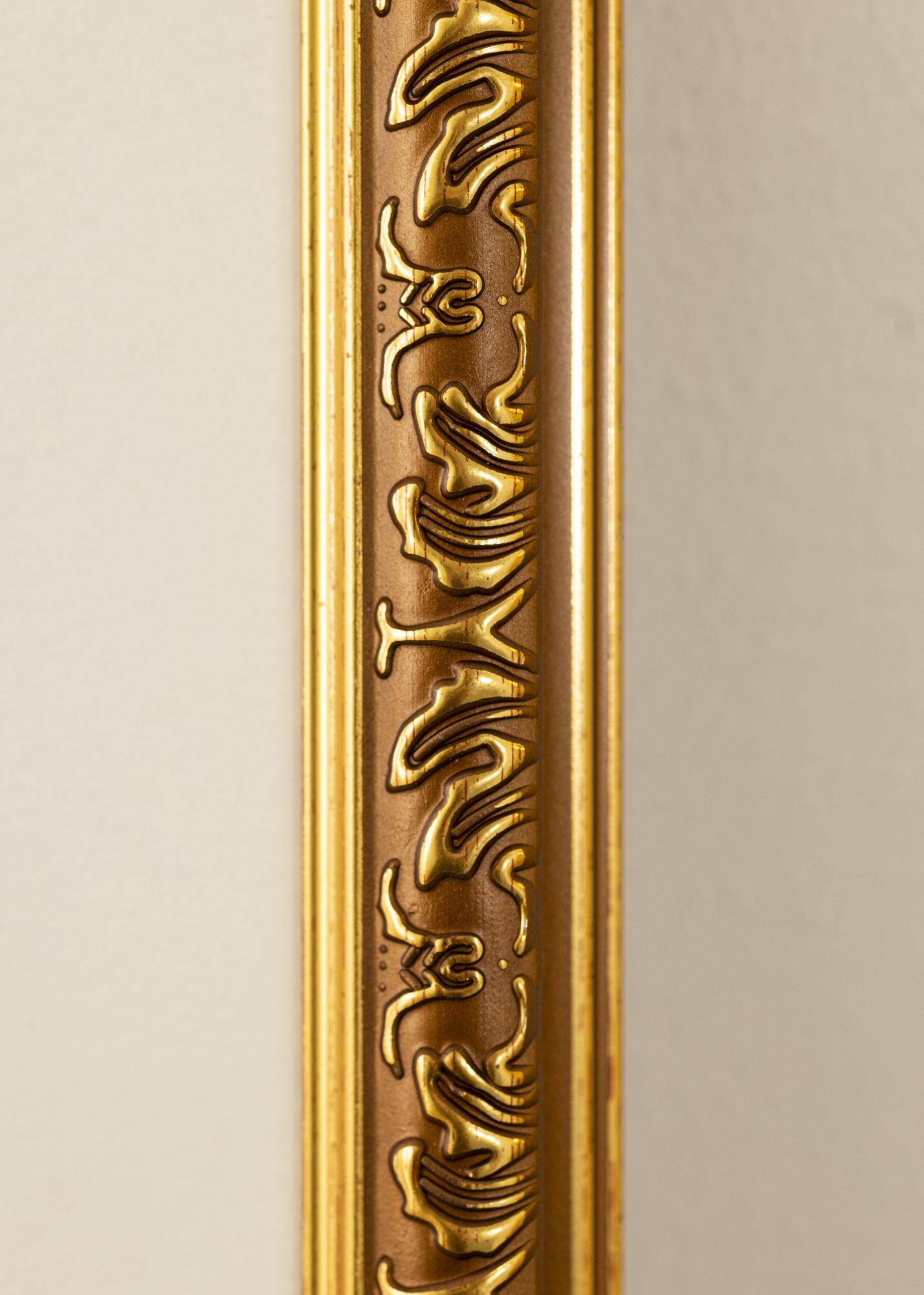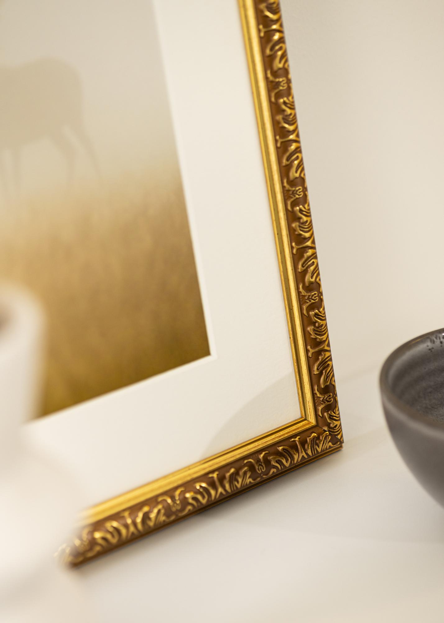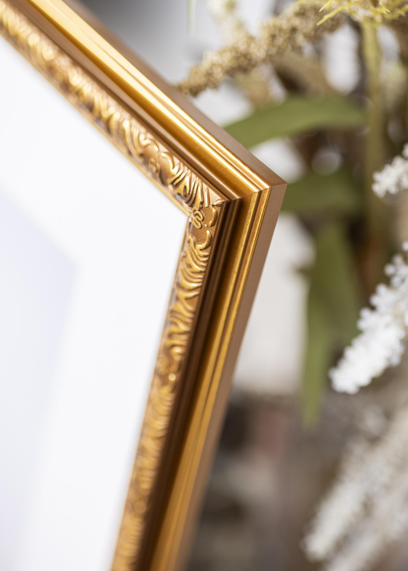 O acabamento dourado luxuoso juntamente com os detalhes decorativos e ornamentados ao longo da borda interna criam uma atmosfera atemporal e tradicional. Isso torna a moldura uma escolha perfeita tanto para estilos de decoração clássicos quanto elegantes. Seja para dar um toque de glamour ao seu lar ou complementar um ambiente já estiloso, esta moldura fotográfica será um ponto focal.