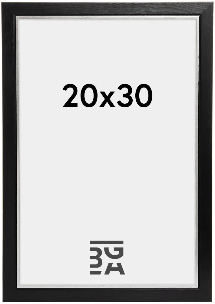 Moldura de foto exclusiva preta de madeira com um pequeno toque extra de uma borda prateada próxima à imagem. Uma excelente escolha quando procura uma moldura que dá uma dimensão extra à imagem. Perfeito para colocar em uma prateleira de quadros para uma bela colagem.