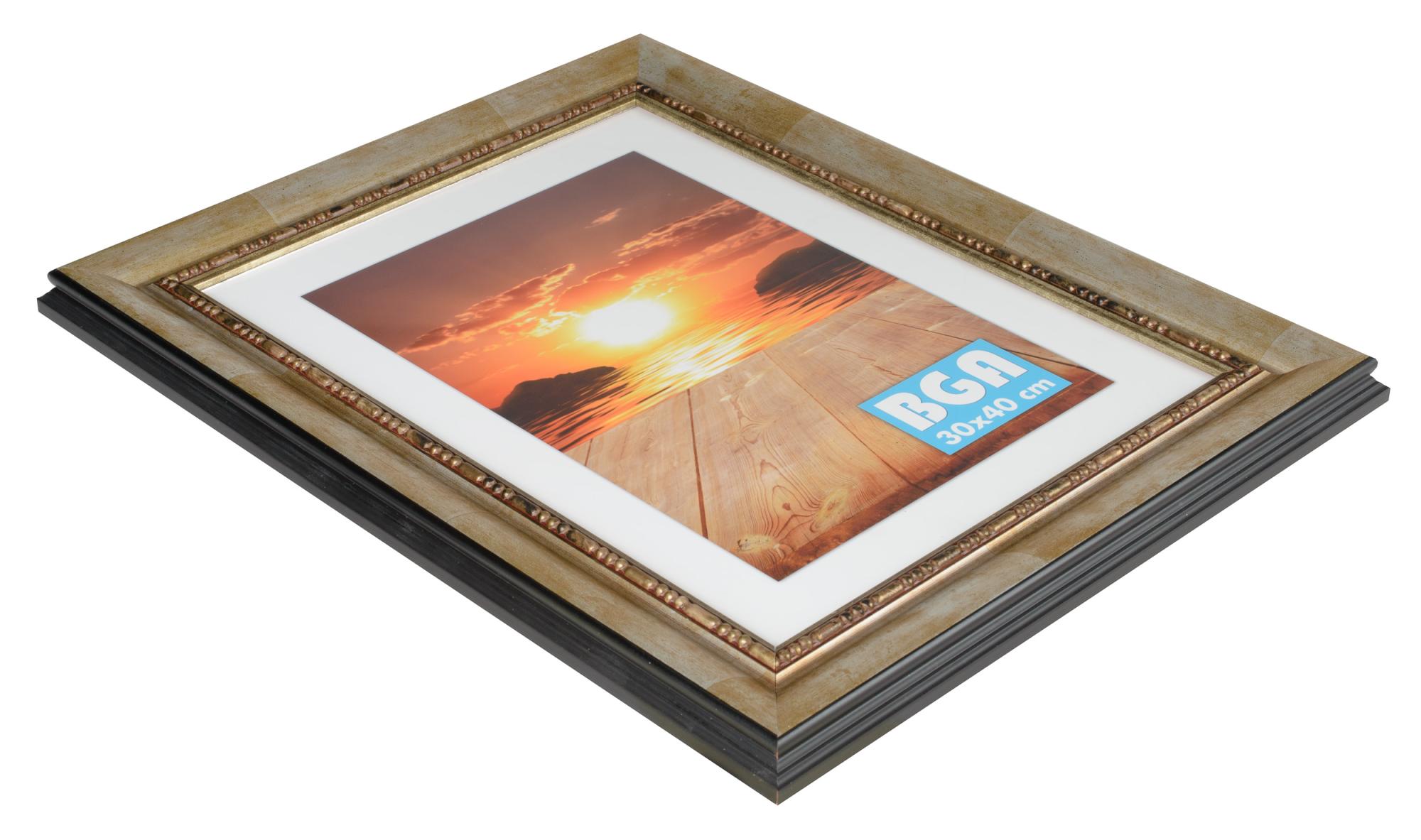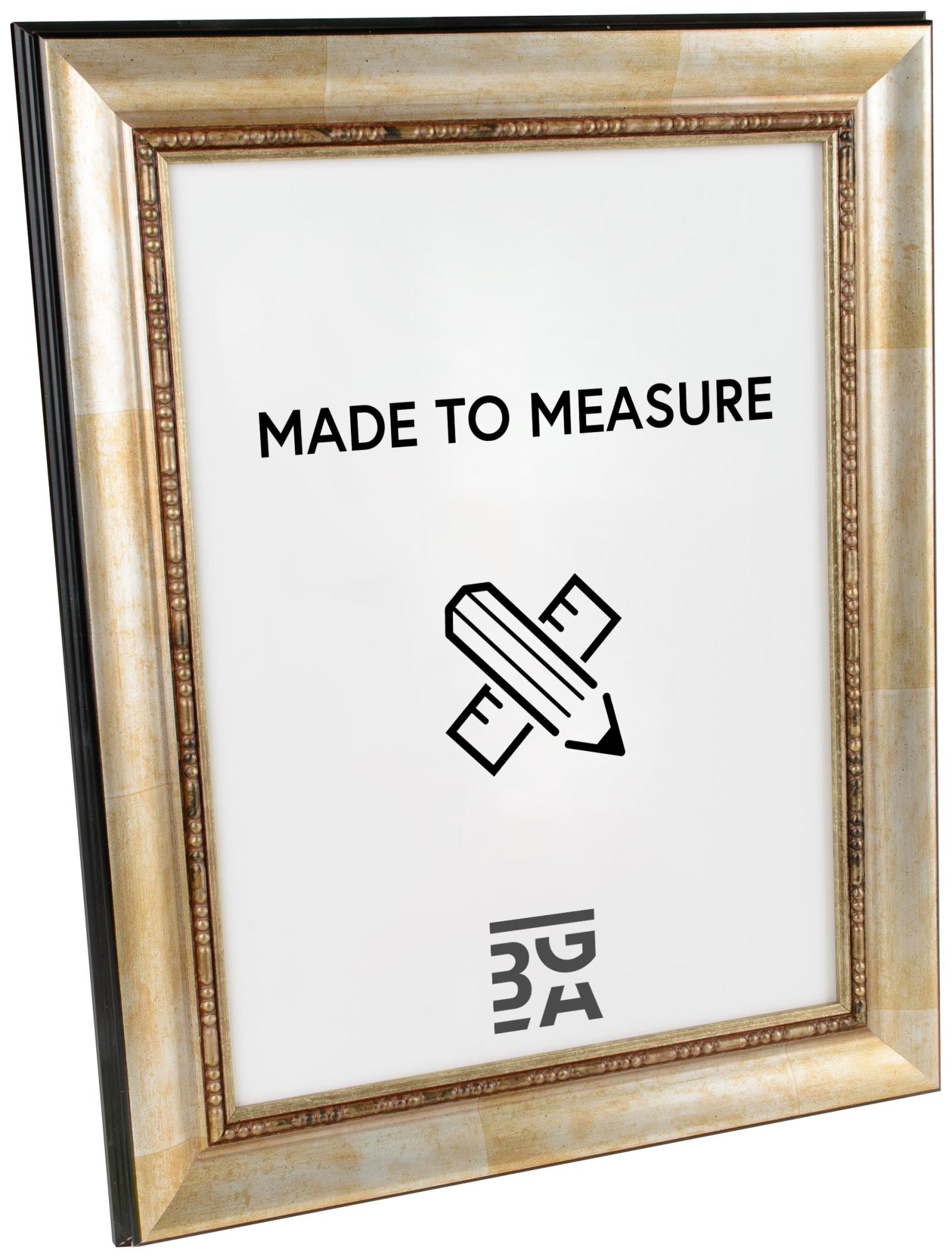 Moldura clássica para retratos de imagens que gosta muito. A moldura tem laterais pretas com uma cor prateada perfilada na frente com decorações próximas à imagem.