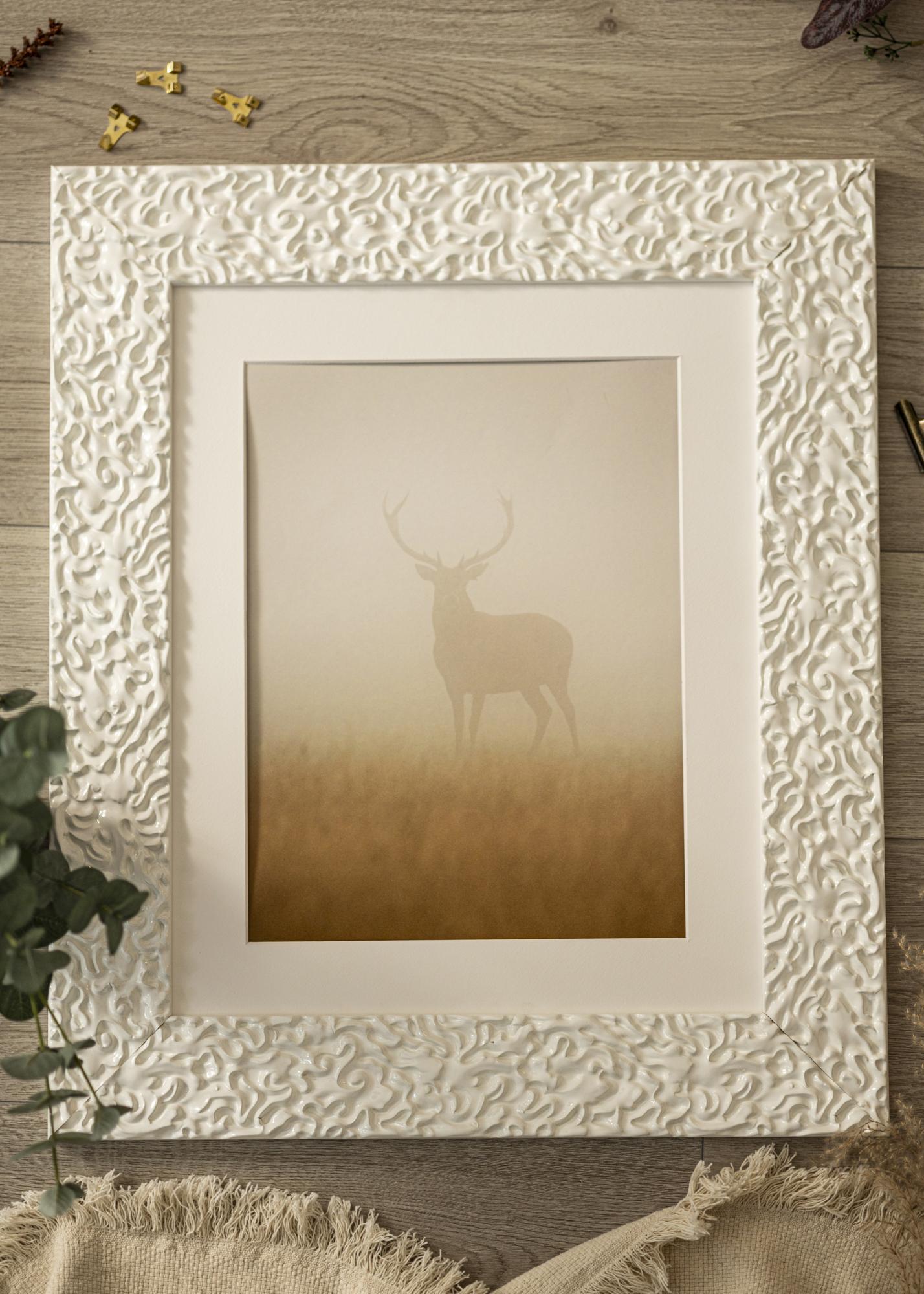 Moldura Westminster Branco é uma moldura feita sob medida fabricada em nossa própria oficina de molduras. Com sua superfície branca de alto brilho e padrões vivos e orgânicos, esta moldura fotográfica oferece uma sensação moderna e elegante. O acabamento brilhante realça as formas suaves e fluidas, conferindo à moldura uma expressão exclusiva que realmente chama a atenção.